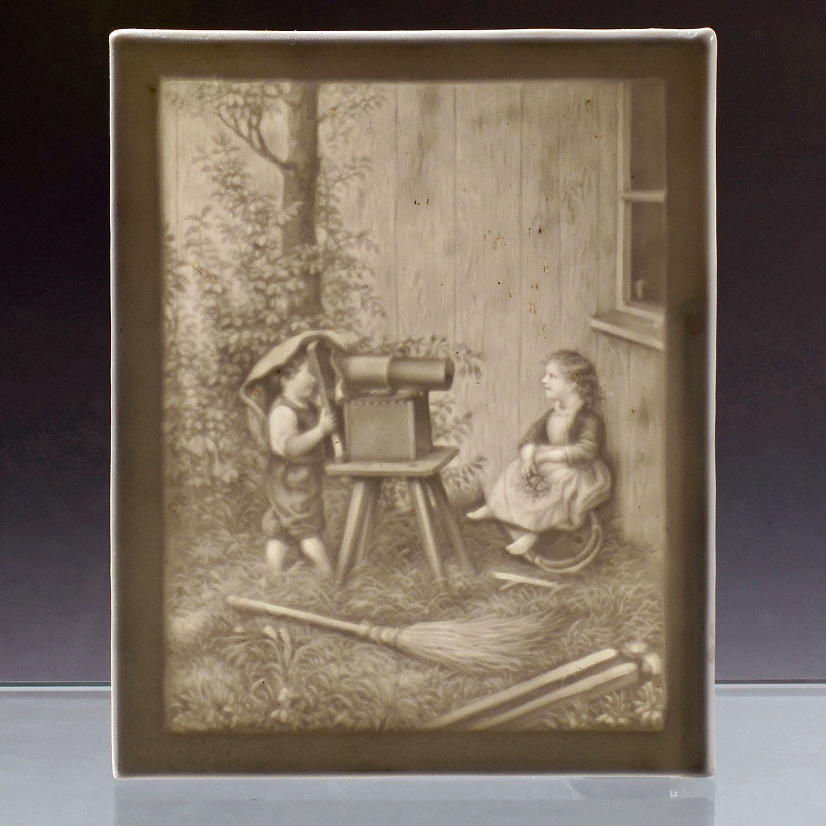 Marked with number "1447", beautiful lithophane with children and camera, size 3 ½ x 4 1/3 in.