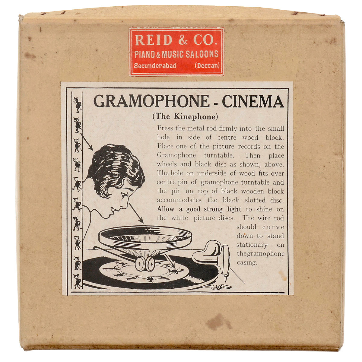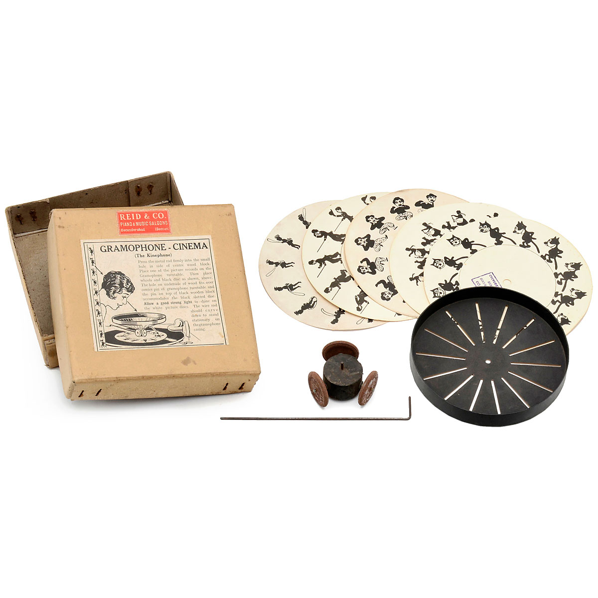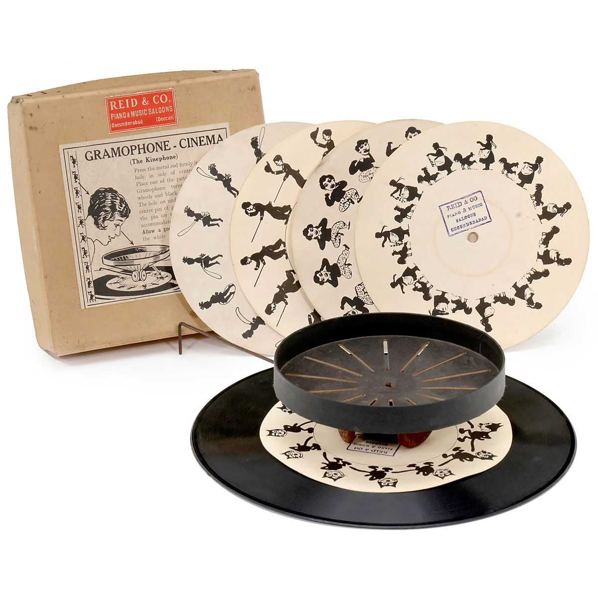An attractive optical toy by Reid & Co., Secunderabad, India, a variation of the "Phenakistiscope". Complete set of 5 picture discs, slotted disc and all accessories, to be used on an ordinary gramophone. – Extremely rare optical toy!