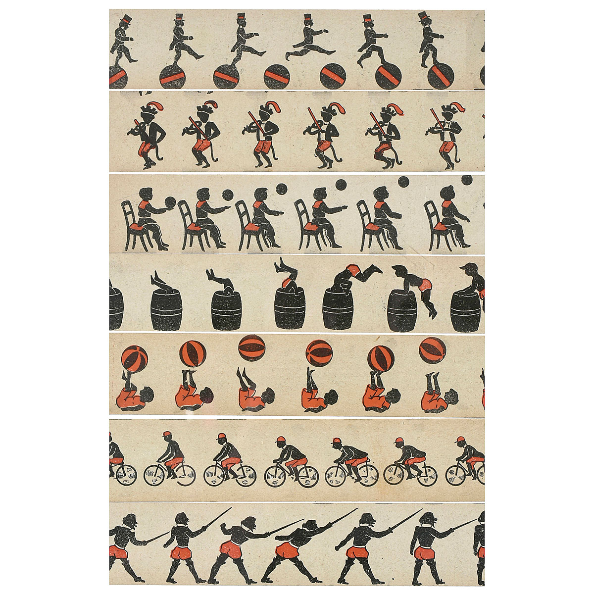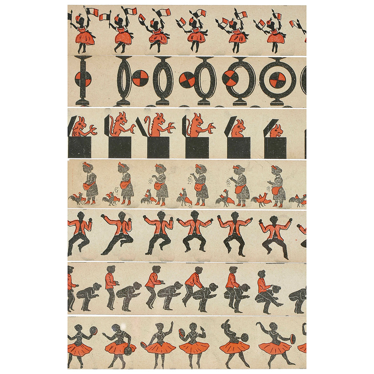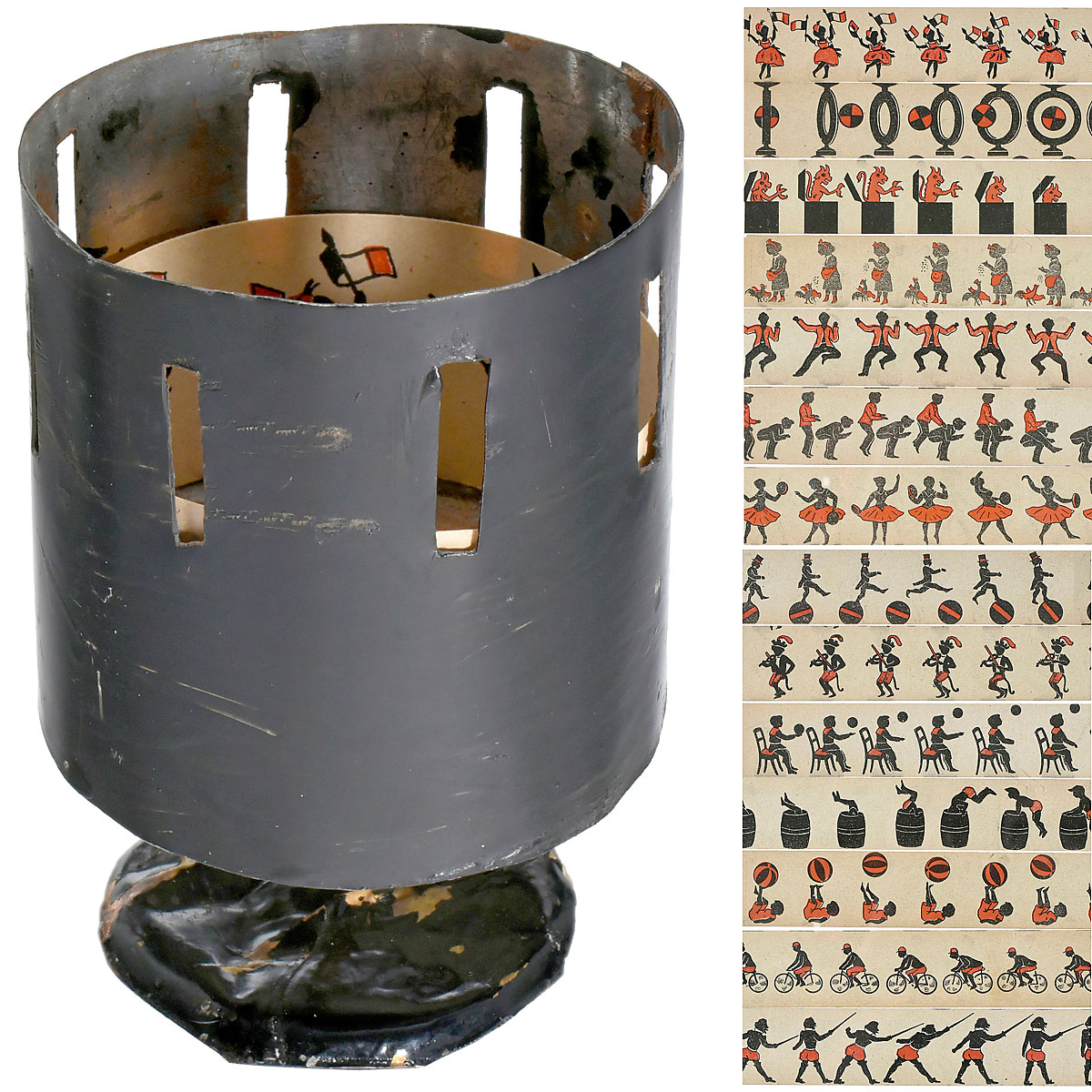 The tiniest tin toy "wheel-of-life" offered yet at auction! Tin drum and brass stand. With 7 twin-sided comic paper strips (approx. 1 1/5 x 7 in.), height 3 in. x 2 1/5 in. diameter. – Extraordinary rare collector's item!