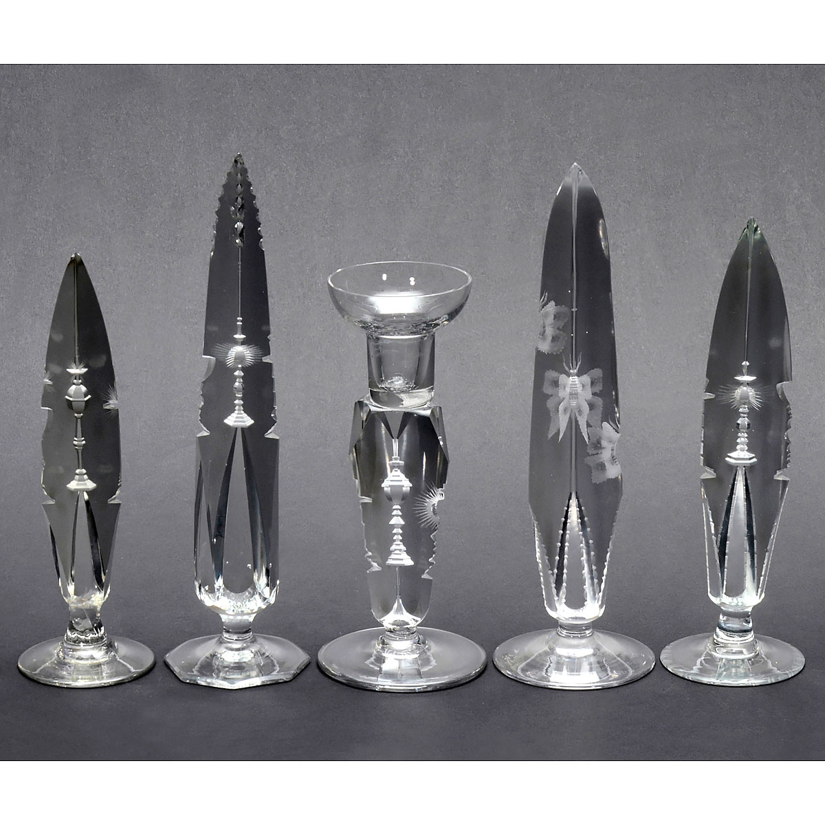 Sharpened crystal glass, 4 x television tower of Berlin and 1 x butterfly, height between 7 and 10 in., one spatiographe as candle holder. Produced presumably between 1970 and 1975.