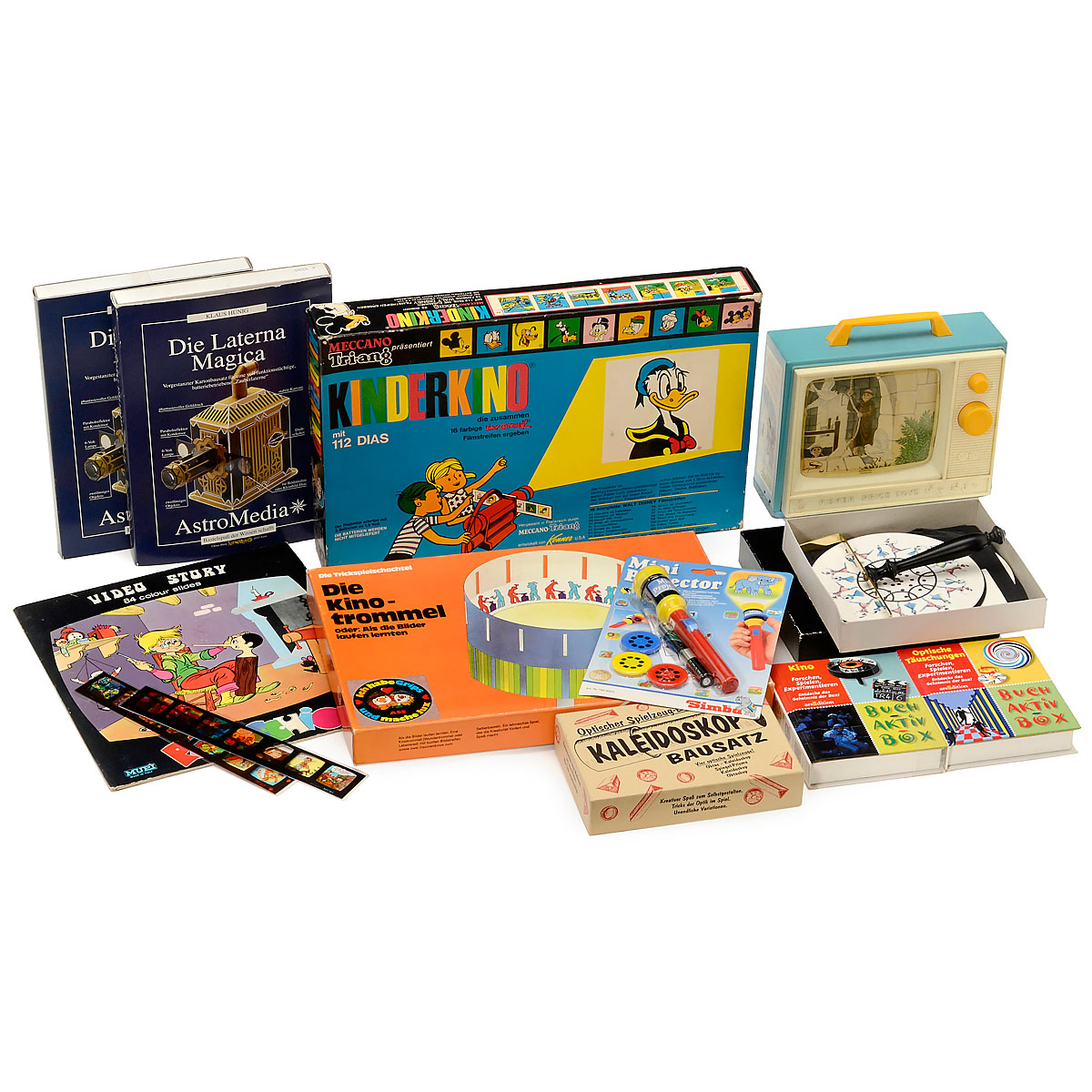 1) Fisher Price Toys. Children portable TV (Kinder TV Gerät), 1981, musical box with endless panorama tape, size 9 ½ x 7 ½ in. – 2) Meccano-Tri-ang, France. Children projector (Kinderkino), 1960s, with 16 filmstrips by Walt Disney, 112 slides and original box. – 3) ASS, Leinfelden. "Die Kinotrommel" (Zoetrope), with original box (construction kit). – 4) Van Cort Instruments Inc. "Doppelscheibenphenakisticope" (Phenakistiscope), construction kit, with 8 discs Ø 17,5 cm and box. – 5–11) Optical toy kit "Kaleidoskop", with box. 2 x "Buch Aktiv Box": "Optische Täuschungen" and "Kino" (optical illusions and cinema). 2 x kit "Die Laterna Magica" (magic lantern). "Mini-Projector" with 3 discs and "Video Story" with 84 slides "Pinocchio".