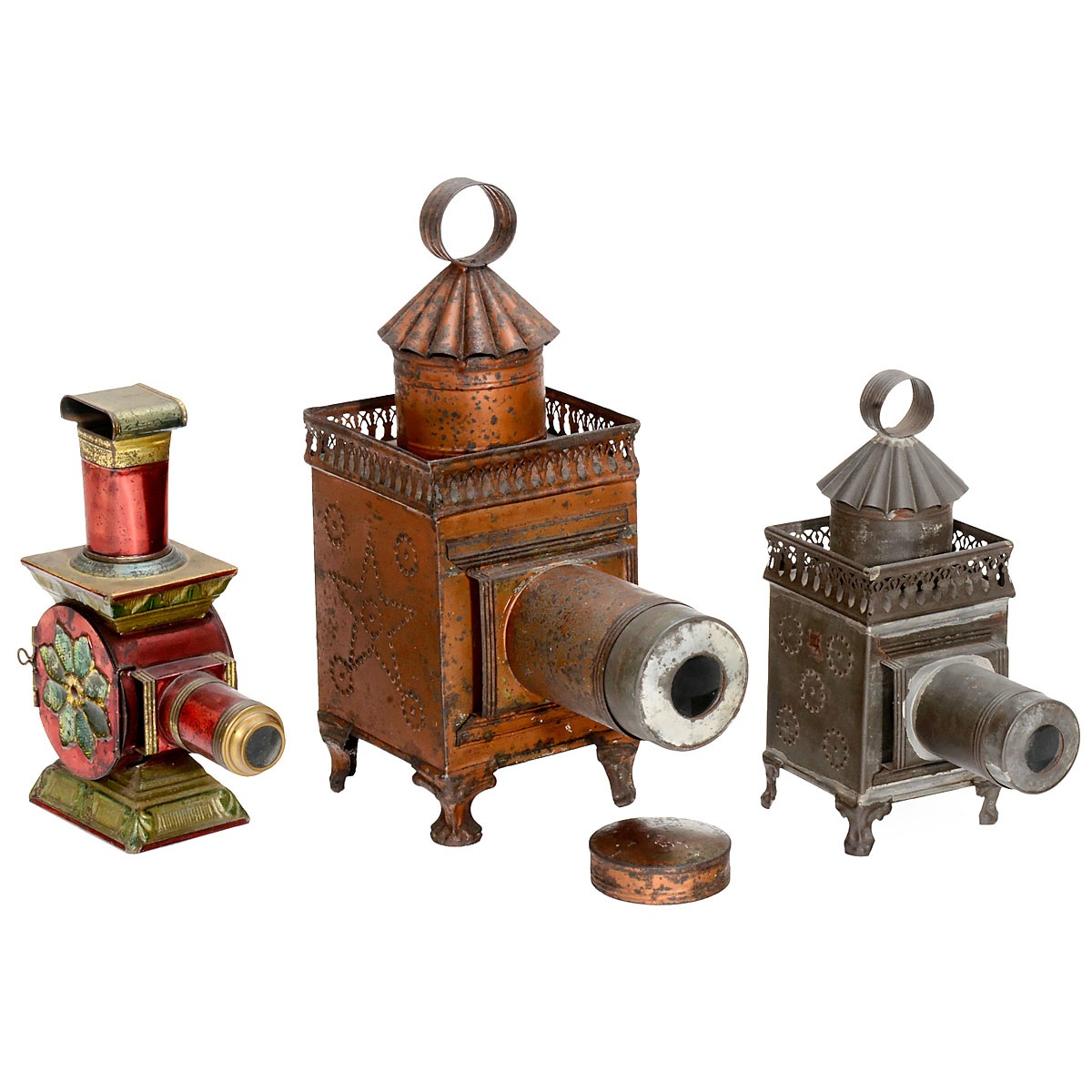 Frères Lapierre, Paris. 1) Magic lantern "Salon", with original wooden box, rare lowest model, for slides of 3 cm (1 1/6 in.), height of the lantern only 7 4/5 in., original polychrome lacquer. – 2) "Carrée", lowest model of the "Carrée", with original burner and mirror, height 8 ¼ in., for slides of 4 cm (1 3/5 in.). – And: 3) "Carrée", height 11 ¾ in., for slides of 6 cm (2 1/3 in.), original lens cap.