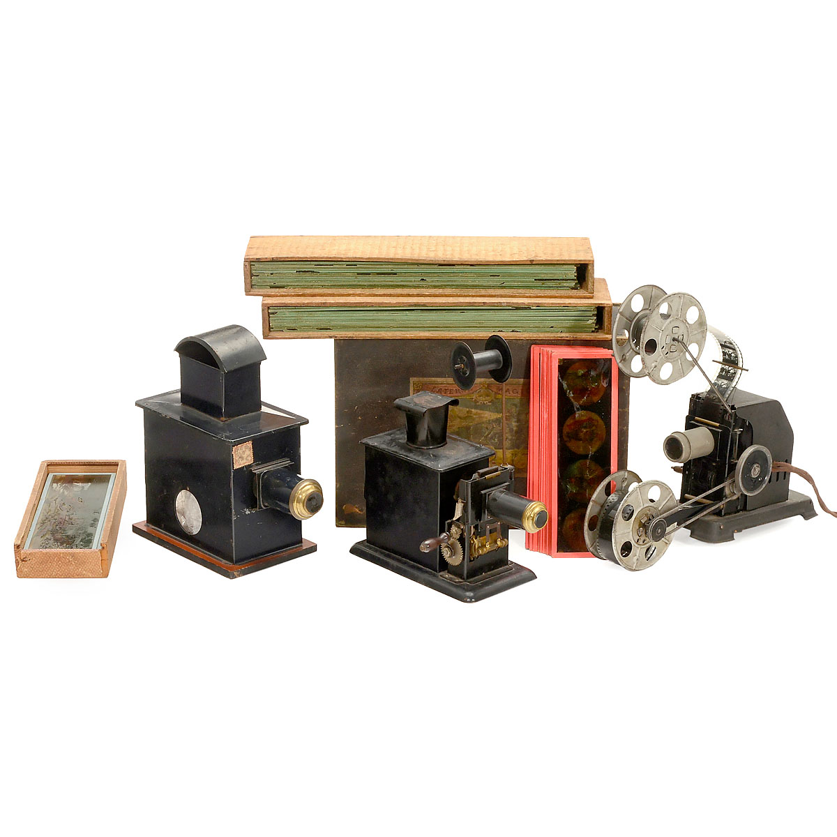 1) Geb. Bing, Nuremberg. Little magic lantern for slides of 1 3/5 in., sheet body, with chimney and original burner. – 2–3) 2 small cinematographs for 35mm film, 1 projector with original wooden box. – And: 4) Magic lantern slides: 26 pieces of 3 1/6 x 14 1/5 in., 12 pieces of 2 ¾ x 8 ¾ in., and 12 pieces of 3 1/6 x 9 ½ in., all in cardboard boxes.
