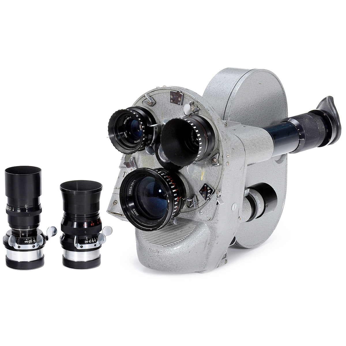 Moskauer Kinowerke. 35mm movie camera with 60m magazine, reflex camera, 3-lens turret: Lomo 1:2/35 mm, 1:2/50 mm, 1:2/28 mm. Additional lenses: Lomo 1:2/75 mm, 1:4/135 mm. – In addition: Compendium, accessories and original case. – Electric functions not tested.
