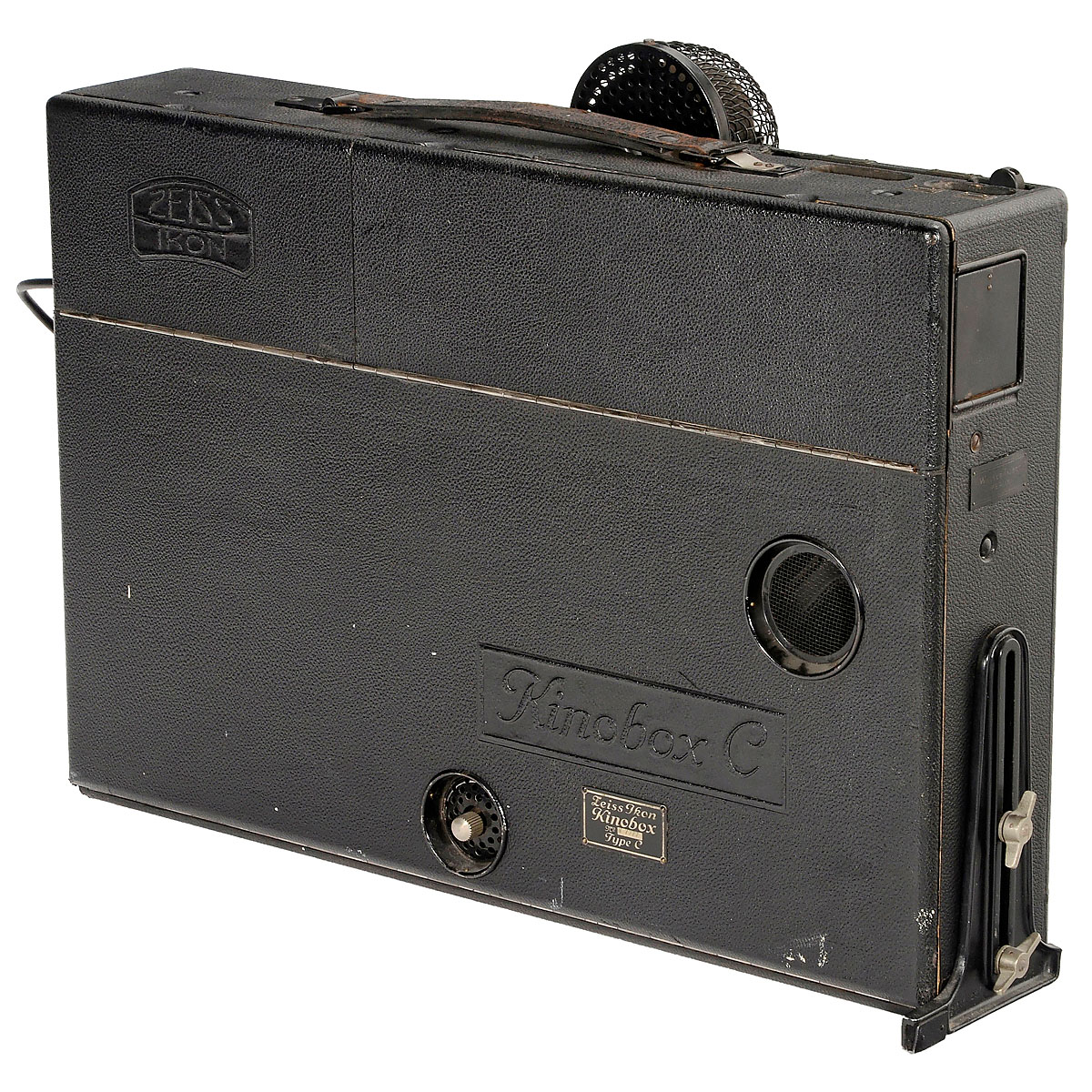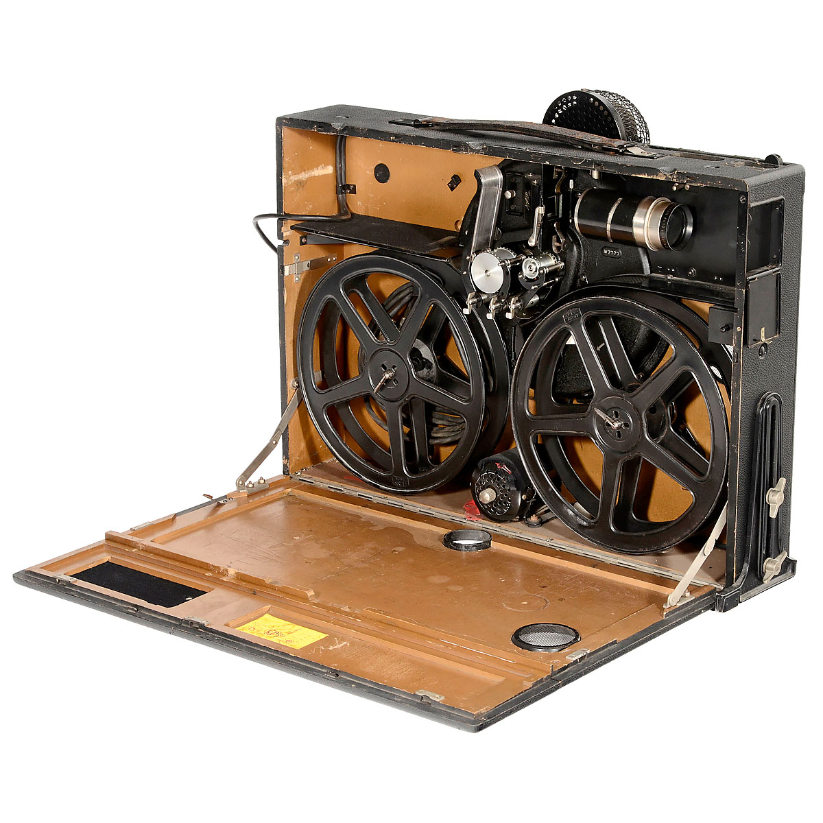 35 mm silent movie touring cinema, suitcase version, for 400 m spools, electric motor drive, lateral attachable lamphouse, Ikon Kinostar 100 mm lens, electric functions untested.