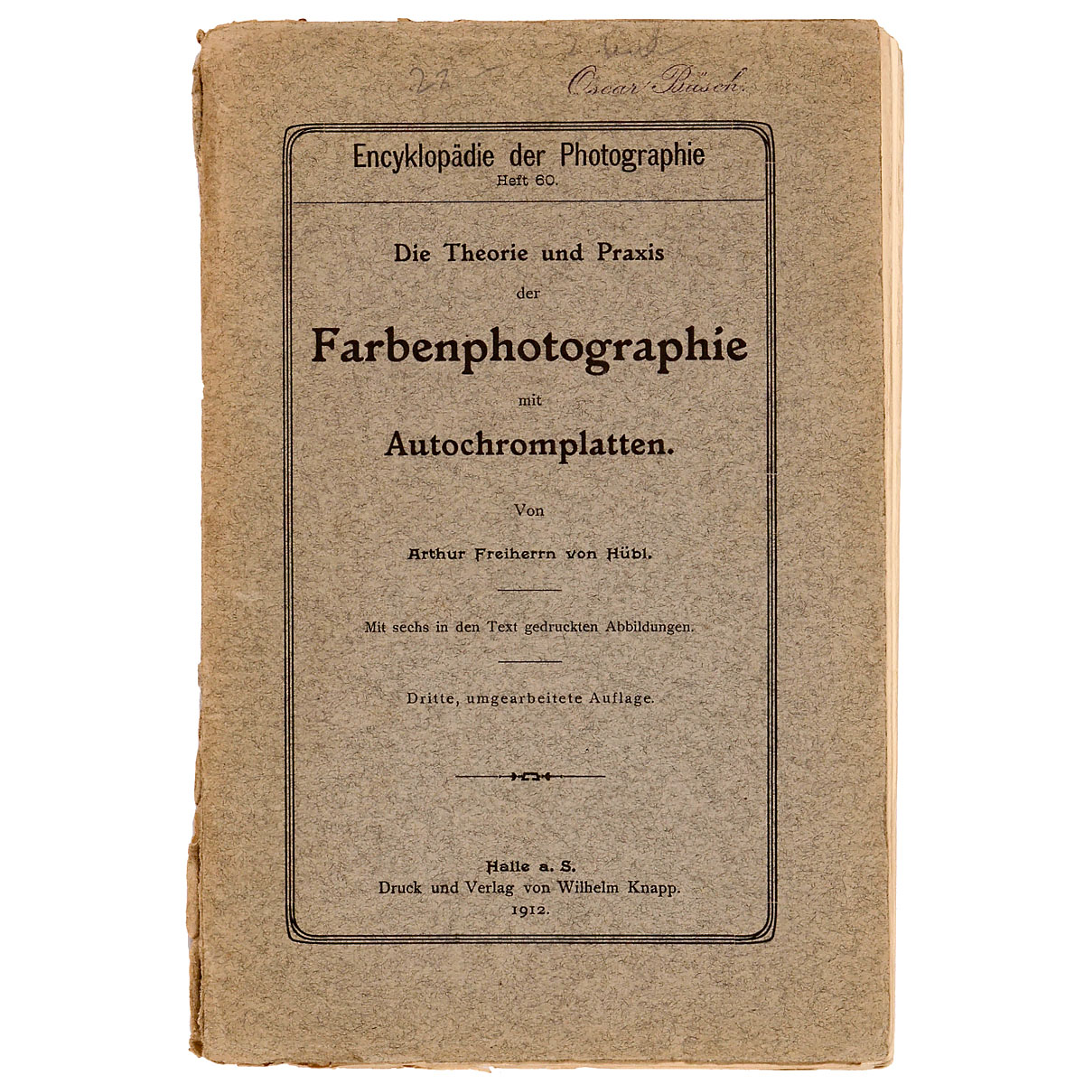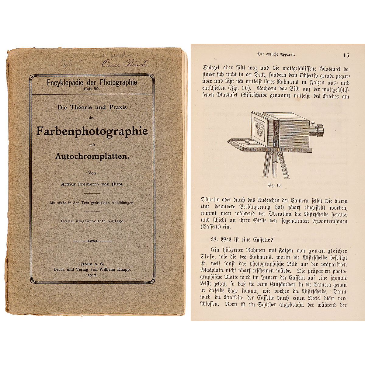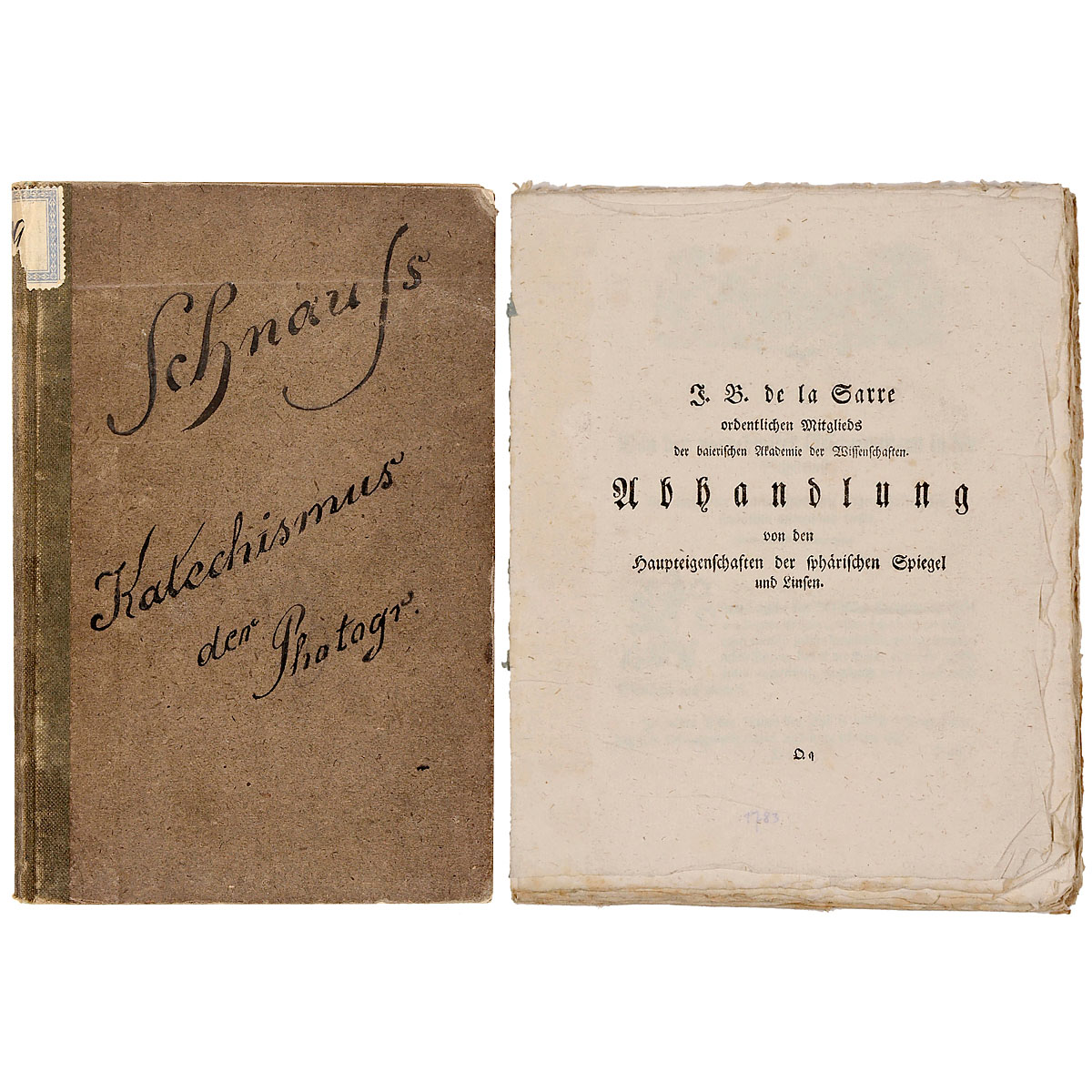 1) Arthur Freiherr von Hübl, "Farbenphotographie mit Autochromplatten", 1912, 100 pages, 6 x 8 ¾ in., pages loose. (3-/–) – 2) Dr. Julius Schnauss, "Katechismus der Photographie", 1876, 176 pages, 11 x 16 cm. (3/–) – 3) J.B. de la Sarre, "Haupteigenschaften der sphärischen Spiegel und Linsen", 1783, approx. 100 pages + 5-page supplement, 7 ½ x 9 in., preowned by Dr. Loher and Fraunhofer! (4/–) – And: 4) F. Marion, "The Wonders of Optics", 1875, 276 pages, 4 ¾ x 7 1/9 in. (3–2/–)