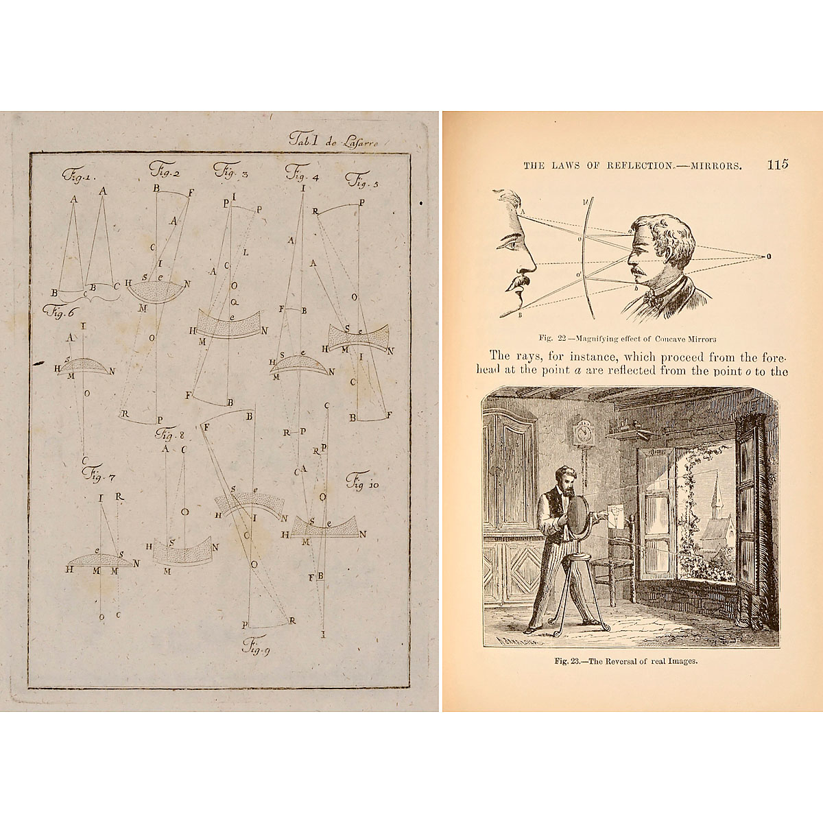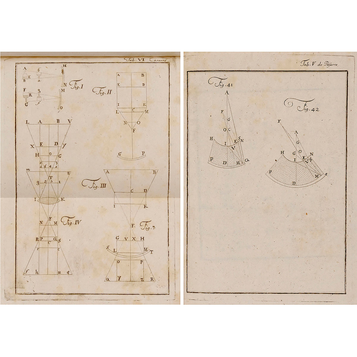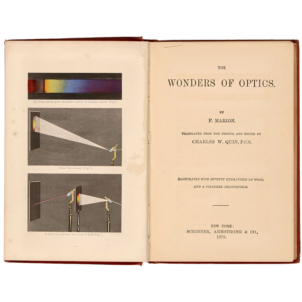 1) Arthur Freiherr von Hübl, "Farbenphotographie mit Autochromplatten", 1912, 100 pages, 6 x 8 ¾ in., pages loose. (3-/–) – 2) Dr. Julius Schnauss, "Katechismus der Photographie", 1876, 176 pages, 11 x 16 cm. (3/–) – 3) J.B. de la Sarre, "Haupteigenschaften der sphärischen Spiegel und Linsen", 1783, approx. 100 pages + 5-page supplement, 7 ½ x 9 in., preowned by Dr. Loher and Fraunhofer! (4/–) – And: 4) F. Marion, "The Wonders of Optics", 1875, 276 pages, 4 ¾ x 7 1/9 in. (3–2/–)