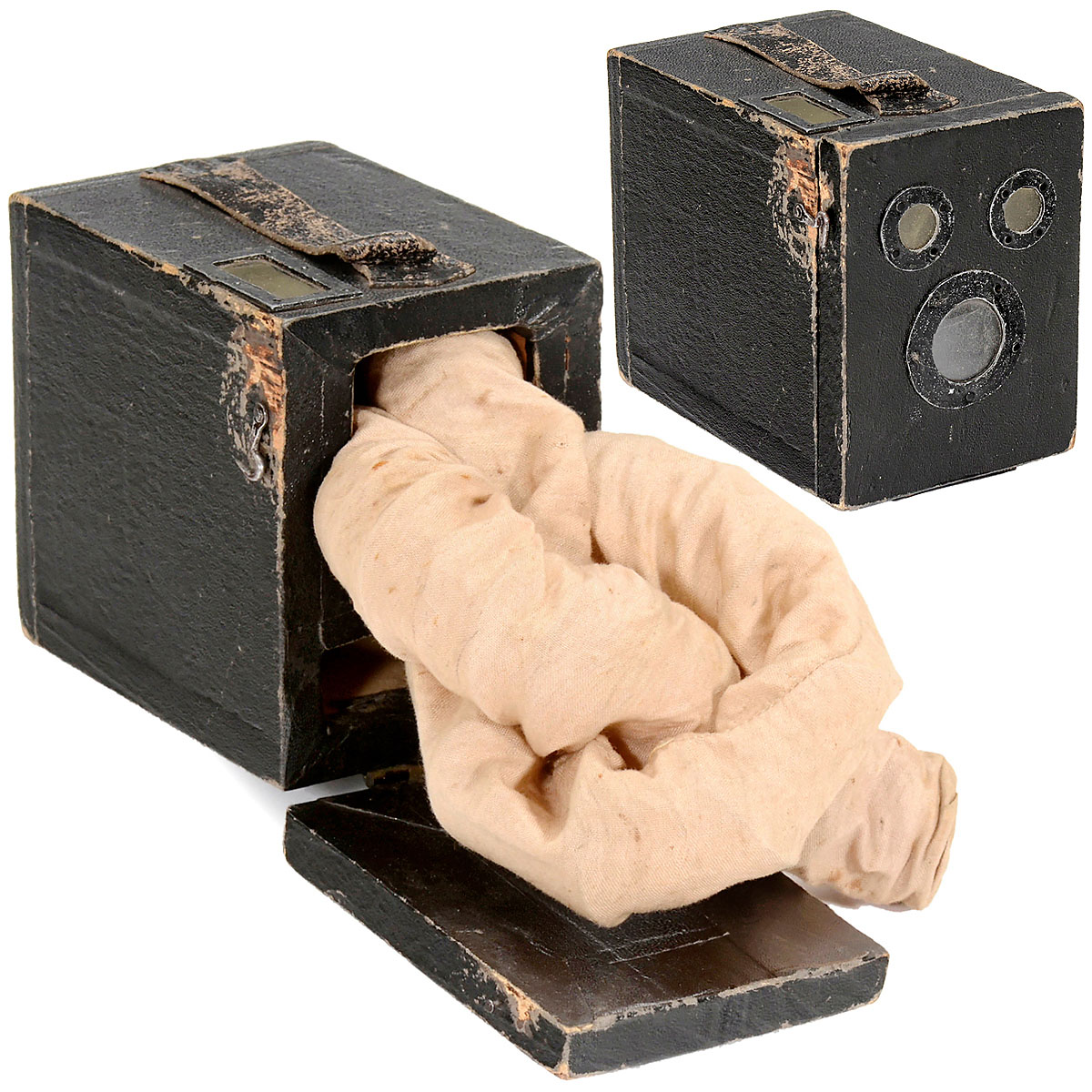 Joke article in form of a box camera, size 3 ½ x 4 1/3 in., with case.