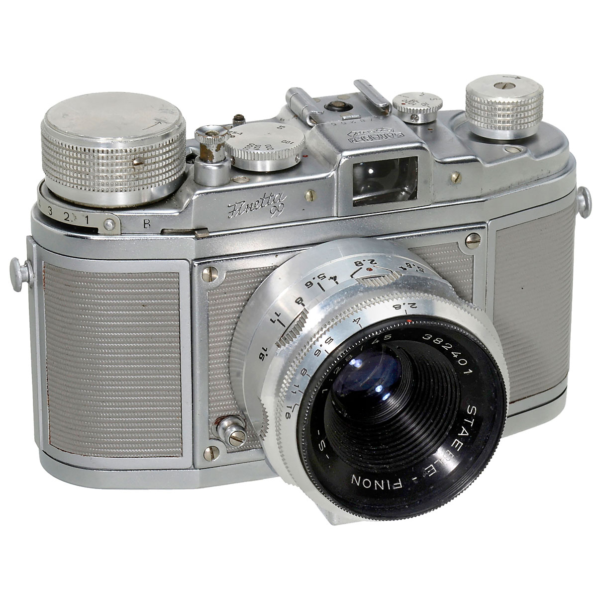 Finetta-Werk, Goslar. No. 078255, grey, model with slow speeds, focal plane shutter stuck. With the rare macro lens Staeble-Finon S 2,8/45 mm, focuses down to 21 cm! Excellent configuration at that time with spring motor and hot shoe.