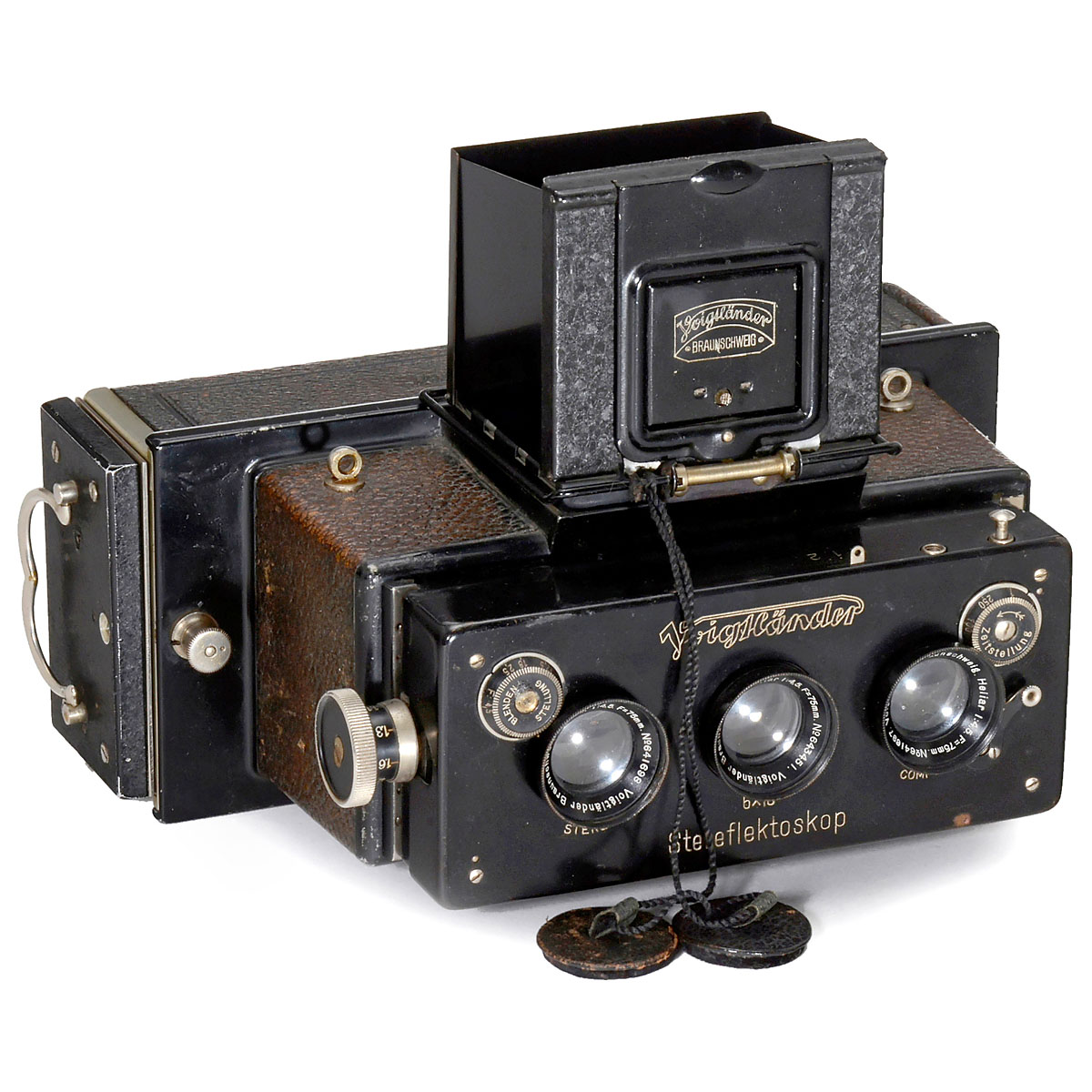 Voigtländer und Sohn, Braunschweig. Stereo camera for plates of 6 x 13 cm, image size 6 x 6 cm, lenses: Heliar 4,5/75 mm, shutter: Stereo-Compur T, B, 1–1/250 sec. (does not work properly), focusing 1,1 m to inf., reflex viewfinder with ground-glass (mirror corroded), with plate magazine.