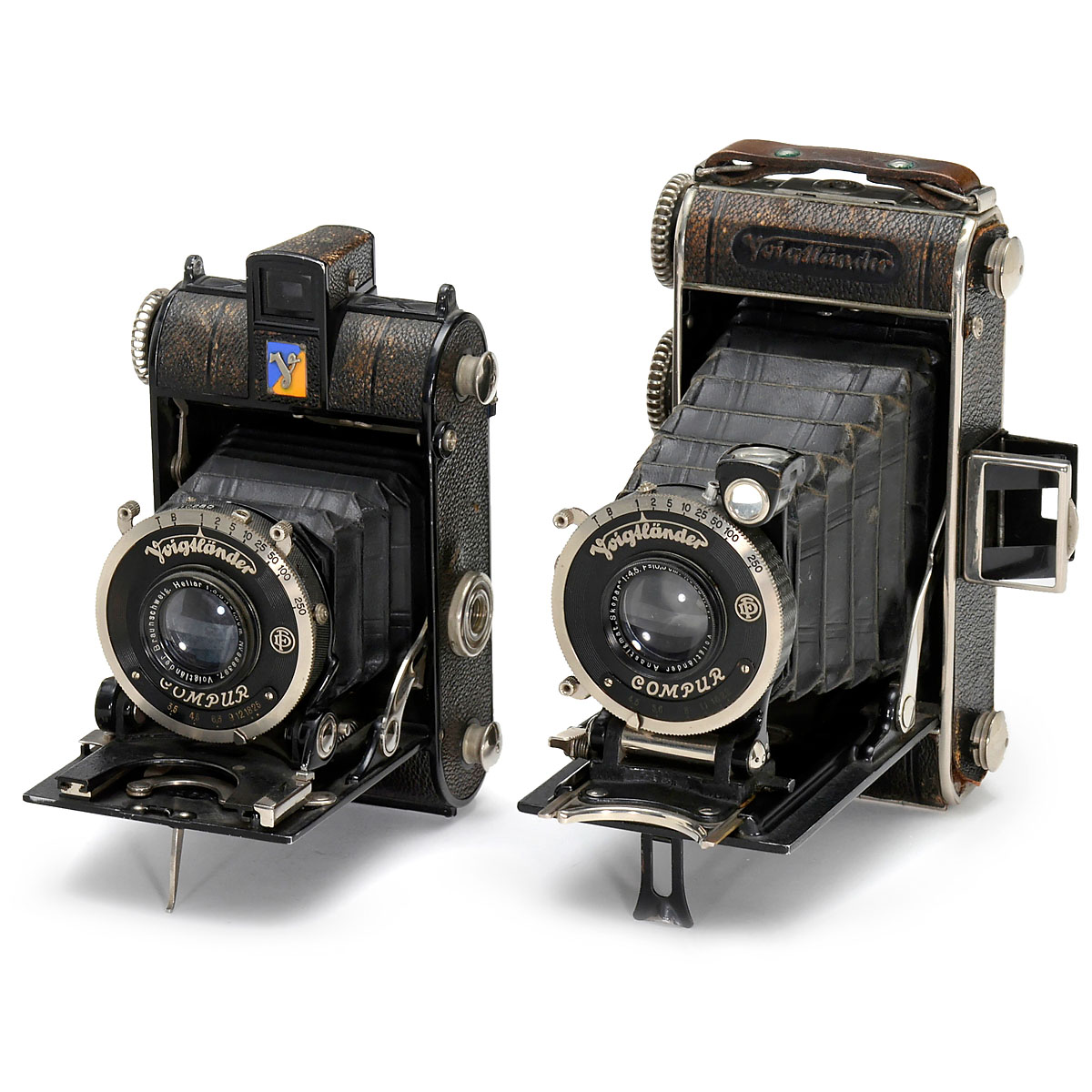 Voigtländer, Braunschweig. 1) Inos II 6 x 9, 1933, Anastigmat "Skopar" 4,5/10,5 cm in Compur, spring-erected mechanism sticks. (3/3–4) – And: 2) Virtus 4,5 x 6, 1932, Heliar 3,5/7,5 cm in Compur, without strap. (3/3)