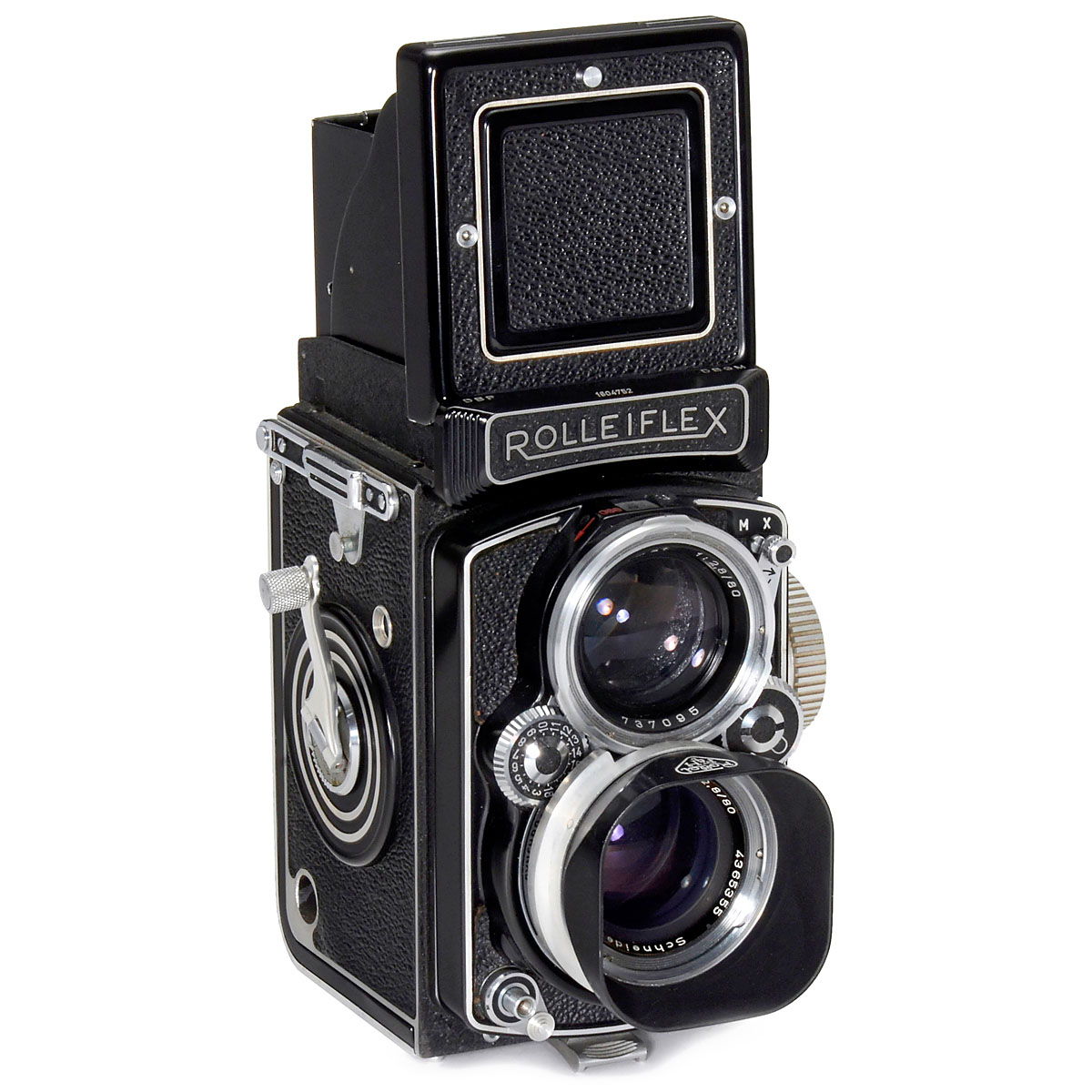 Franke & Heidecke, Braunschweig. No. 1604752, with Xenotar 2,8/80 mm, no. 4365355, Synchro-Compur. With lens cap, lens hood and maker's case. – Produced for one year only.