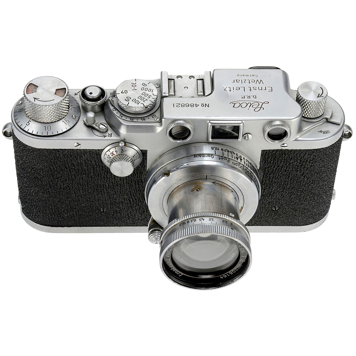 Leitz, Wetzlar. Leica IIIc, no. 486821, converted to Leica IIIf, sharkskin vulcanite, dent in top housing. Summar 2/5 cm, no. 208164, feet, front cap.