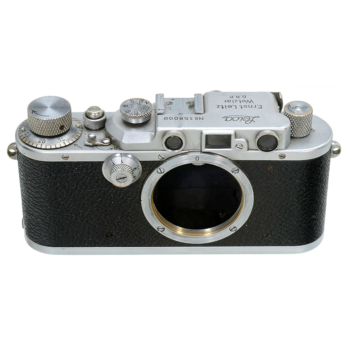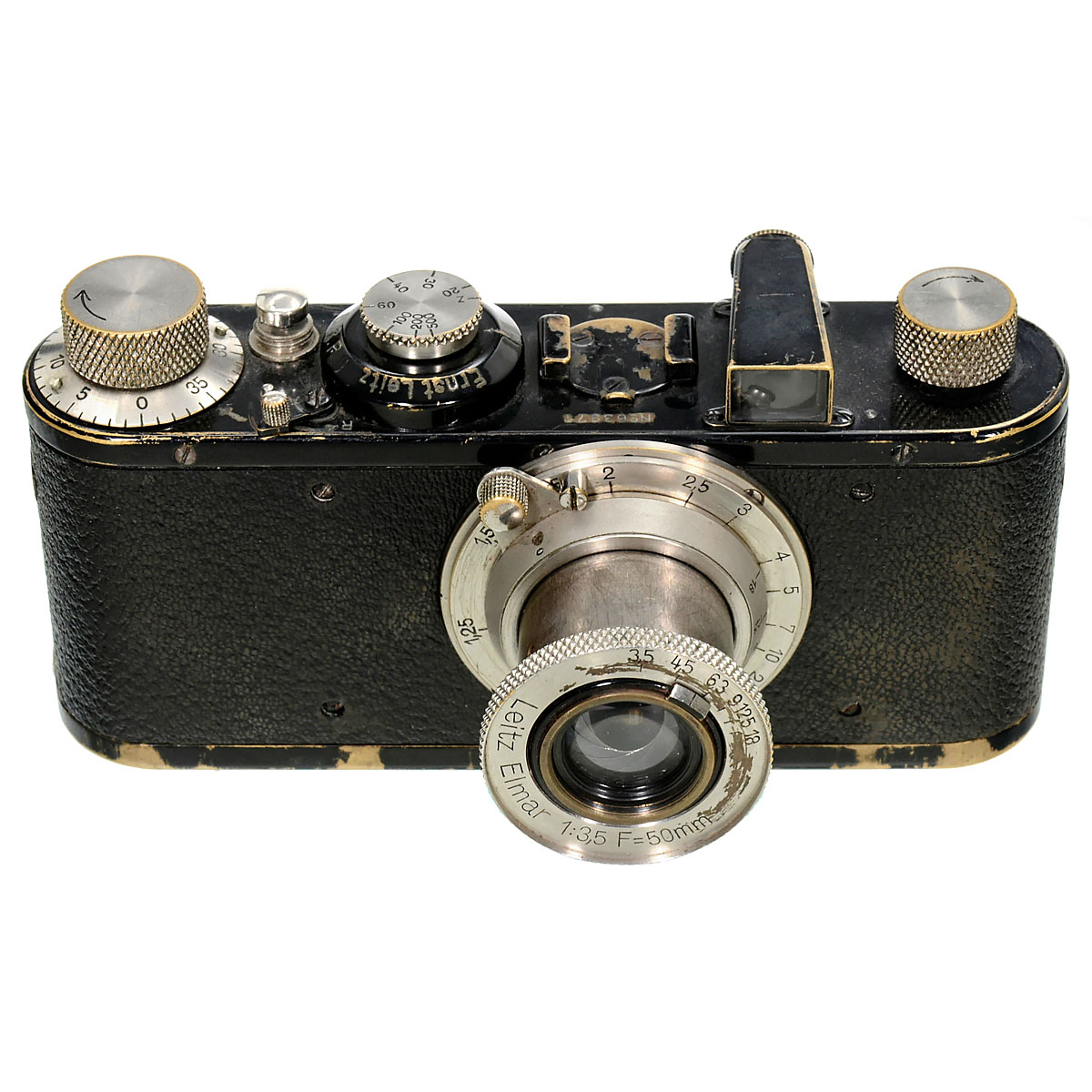 Leitz, Wetzlar. 1) Leica I (A), 1931, no. 63971, converted to I (C), standardized lens mount, round accessory shoe, Elmar 3,5/50 mm, without serial number, engraved "0", dent in front ring. (3-/3-) – And: 2) Leica IIIa (G), 1935, no. 158009, shutter working well. (3/3–2)
