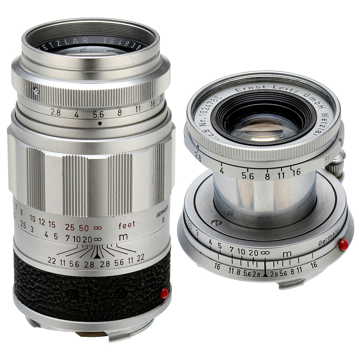 Leitz, Wetzlar. 1) Elmarit 2,8/90 mm, no. 1649390, 1959, some dust and fungus, with front cap and container. – And: 2) Elmar 2,8/5 cm, no. 1624785, 1958, meter, cementing fault/fungus, with container. – In addition: Rear lens cap and body cap.