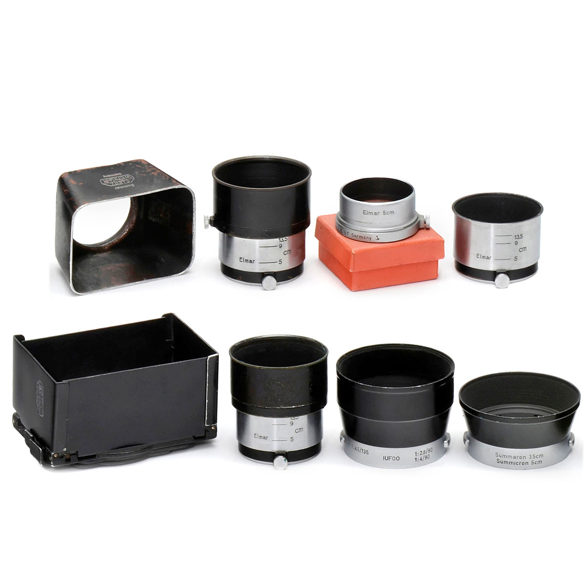 Leitz, Wetzlar. 8 lens hoods for Leica: SOOPD, SOOMP, IROOA, IUFOO, 3 x FIKUS (1 incomplete) and FISON.