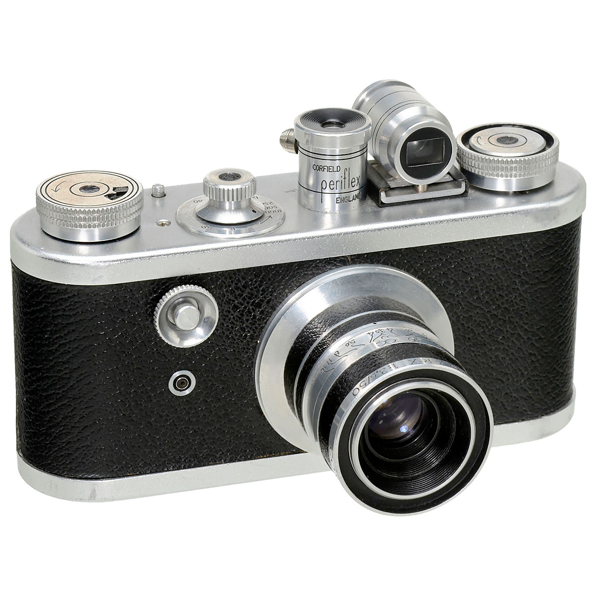 Corfield, England. Periflex (1) silver, no. 616141, focal plane shutter, interchangeable Lumar-X 3,5/50 mm lens. Attractive Leica copy with periscope reflex viewfinder and optical viewfinder.