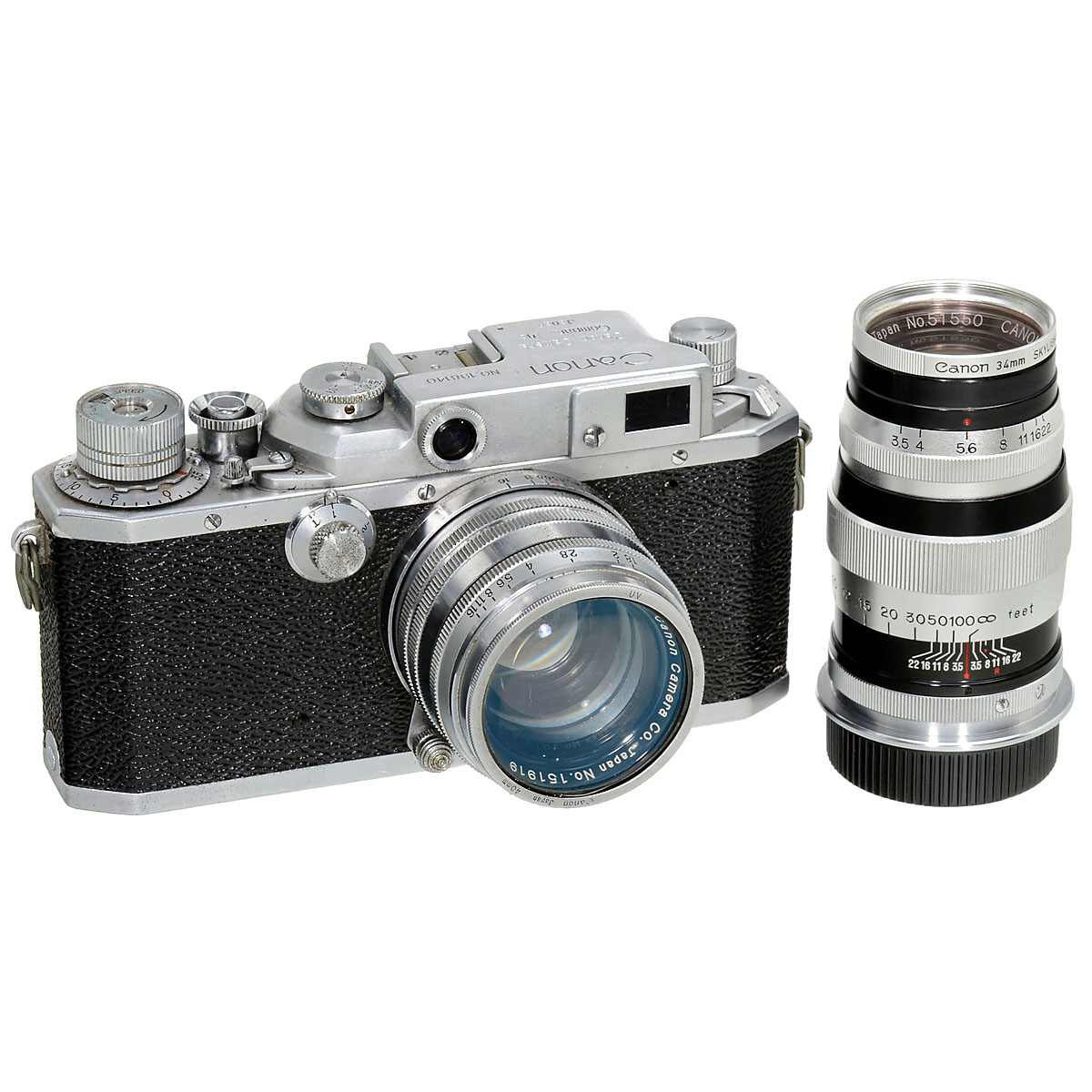 Canon, Japan. 1) Canon II D2, no. 198140, with case. (3-/3) – 2) Canon Lens 1,8/50 mm, no. 151919, feet, UV filter, fungus. (2–3/4) – And: 3) Canon Lens 3,5/100 mm, no. 51550, feet, black/chrome, skylight filter, both caps, with case, fungus. (2/4) – Both cases with the legendary 25th anniversary Canon "Eagle" logo.