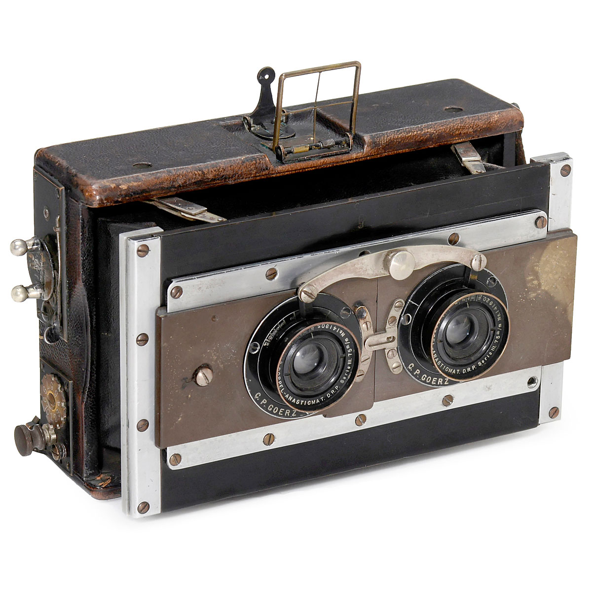 C.P. Goerz, Berlin. Strut-folding stereo camera for plates of 6 x 13 cm, lenses: Goerz Doppel-Anastigmat Serie III 4,6/75 mm (rear elements hazy), distance of lenses adjustable, iris diaphragms 4,6 to 192, focusable 1,5 m to inf., focal plane shutter (does not work properly). One lens can be moved into the center for panoramic pictures.