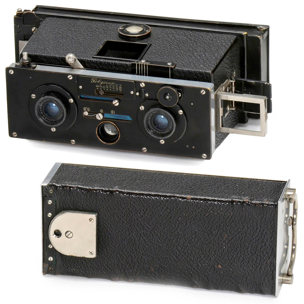 Ica AG, Dresden. Stereo camera for plates and sheet film of 45 x 107 mm, image size 4 x 4 cm, lenses: Ica Dopp.-Anastigmat Maximar 6,8/6 cm, pinhole diaphragms 6,8, 9, 18, guillotine shutter Z, 1/3–1/250 sec., focusing 1 m to inf., reflex viewfinder and folding frame finder, with plate magazine, sheet film magazine and case.