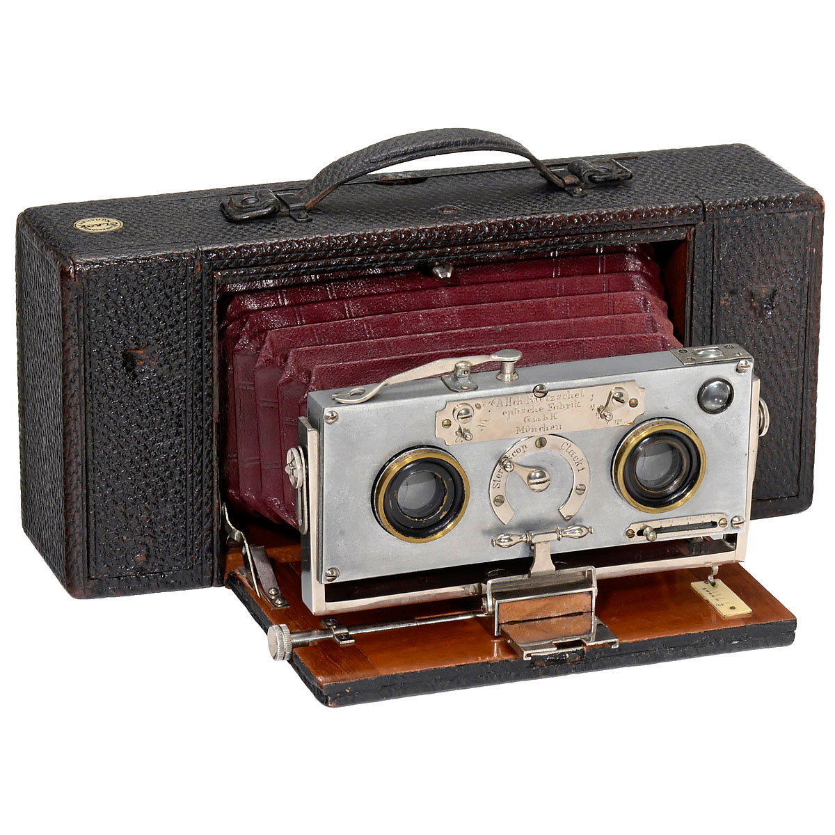 A. Heinrich Rietzschel, Munich. Wood folding-bed stereo camera for 9,3 cm wide rollfilm, image size 8 x 8 cm, lenses: Rietzschel Anastigmat 8/14 cm, iris diaphragms 8 to 96, two-blade shutter Z, 1–1/100 sec. (sluggish), brilliant viewfinder.