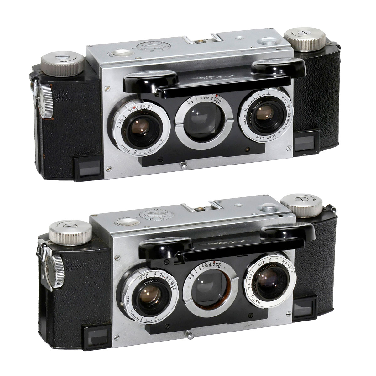 David White Co., Milwaukee. 1) Stereo Realist 3,5 (Model 1041), 1947, stereo camera for 35 mm film, image size 24 x 23 mm, lenses: David White Anastigmat 3,5/35 mm, two-blade shutter T, B, 1–1/150 sec., reflex-Galilean viewfinder with double-image rangefinder, with case and film identifier unit. (2/2) – And: 2) Stereo Realist 2,8 (Model 1042), 1951, stereo camera for 35 mm film, lenses: David White Anastigmat 2,8/35 mm, shutter: T, B 1–1/200 sec. (2/2)