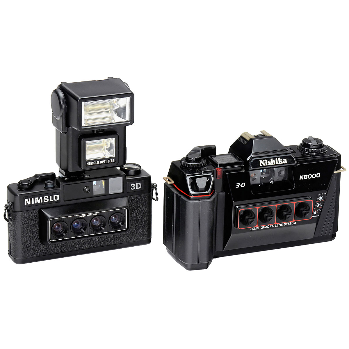 1) Nimslo Corporation, USA. Nimslo 3D, c. 1980, camera for lenticular stereo images, image size 22 x 18 mm, forerunner of many similar cameras, with flash Nimslo Opti-Lite. – 2) Nishika Optical Systems, Hong Kong. Nishika N8000, 1989, camera for lenticular stereo images, image size 22 x 18 mm. – Literature: W. Weiser, "Stereo Cameras Using Film", pp. 80 and 82.
