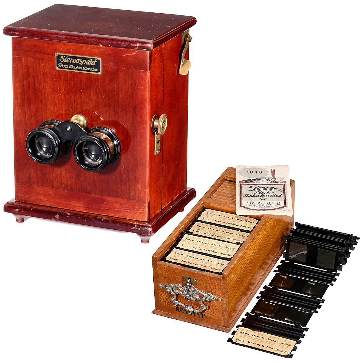 Ica AG, Dresden. Series stereo viewer for plates of 45 x 107 mm, rack-and-pinion focusing, with 12 concertinas filled with plates in wooden box. 12 plates fit into each concertina, which serves as an image-transport.