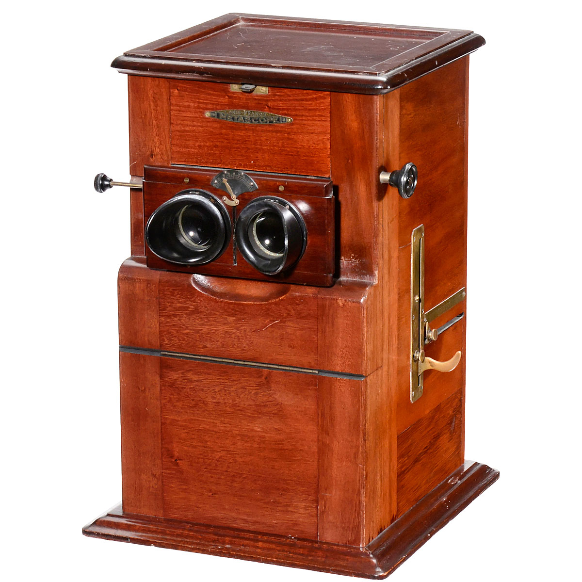 Manufacturer: A. Mattey, "Unis France" for 25 stereo slides of 6 x 13 cm in trays, mahogany case, focusing with rack and pinion, oculars adjustable. Good condition! Full working order. – In addition: Approx. 170 stereo slides (amateur photos) and 9 trays.