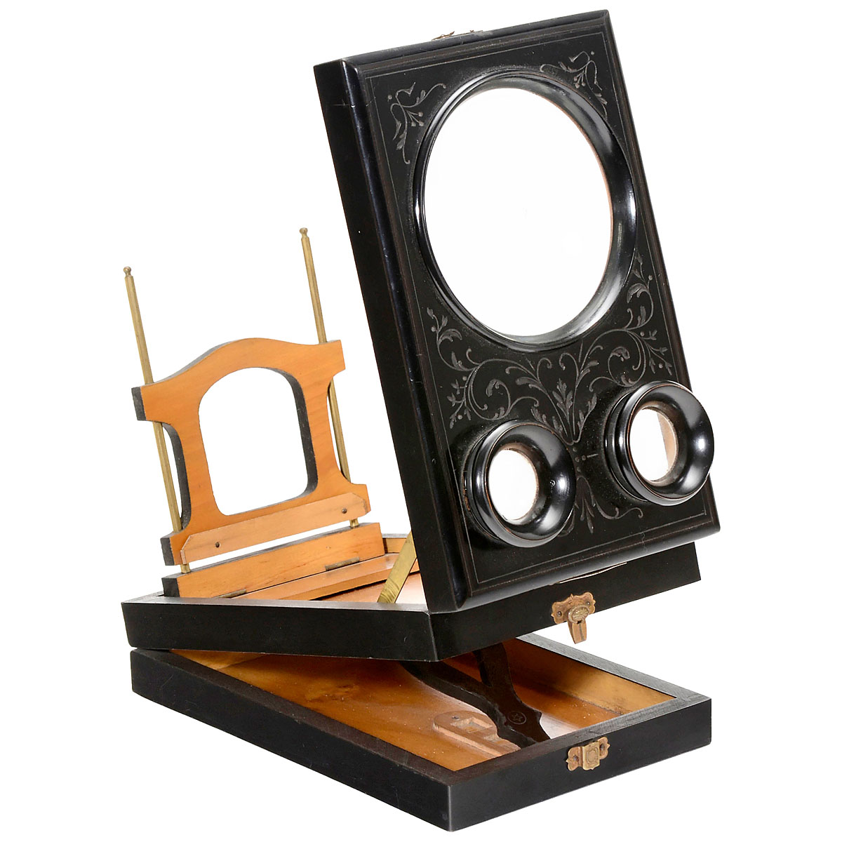 Marked "E. Hautecceur, 35 Avenue de l'Opéra 35 Paris", black-lacquered wooden body with incised decoration, lens Ø 4 in., oculars Ø 1 1/6 in., for stereo cards of 6 x 13 cm and other formats. Height of the viewer 12 ½ in.