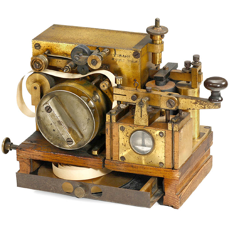彩色书写头, 发射和接收器, 序列号 3118, 原厂上漆黄铜, 弹簧马达(功能正常), 抽屉带纸带, 尺寸仅 17 x 10 x 14 cm.