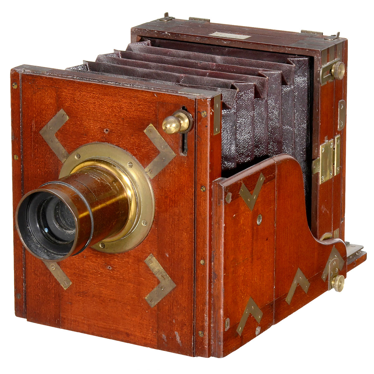 W.W. Rouch & Co., London. Small field camera for picture size 4 ¾ x 6 ¼ in., cherry wood with solid brass fittings, dark-red square bellows, focusing screen back. With early brass lens "Triple Achromatic Lens", no. 4448, by J.H. Dallmeyer with 3 waterhouse stops. – Rare!