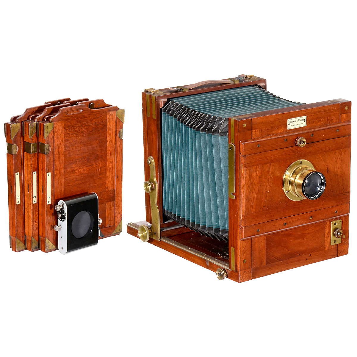 Presumably Ernemann, Dresden, Globus-type, for Heinrich & Poulsen in Copenhagen. Plate size 13 x 18 cm, teak with attractive and solid brass fittings, rotating back, spindle drive, green bellows with black corners, Tessar 6,3/21 cm (no. 123086) with iris stop, focusing screen back and 3 wooden cassettes. – In addition: Slip-on focal plane shutter (working). – Wonderful field camera!