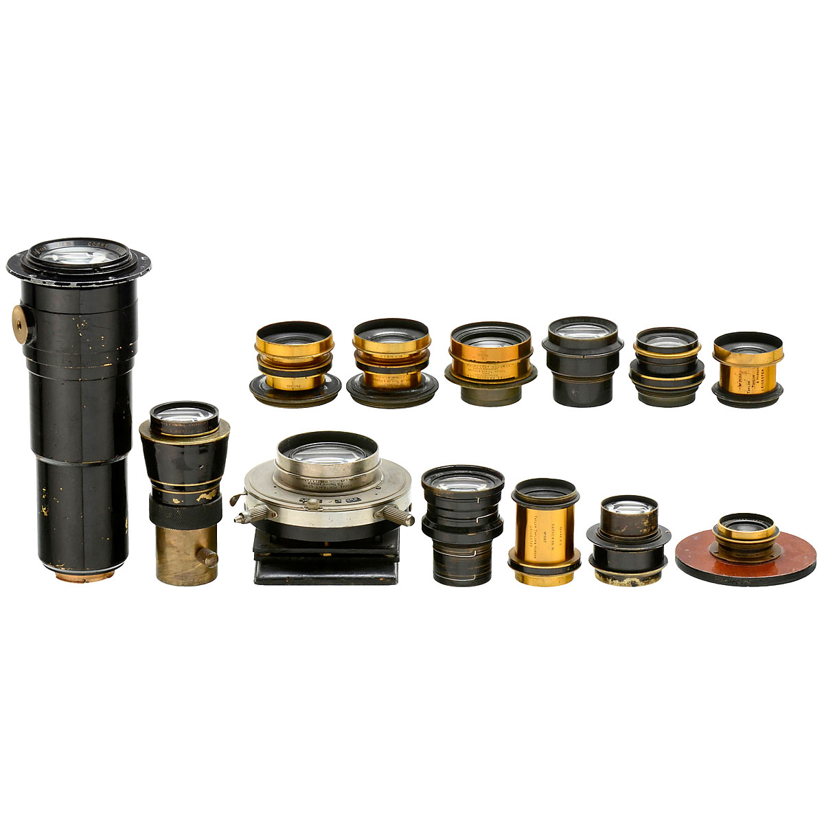 Taylor Taylor & Hobson, Leicester. 1) 6 ½ x 4 ¾ R.V. EQ. Foc. 8,69 in., no. 6167, iris stop. – 2) Series V 8 x 5 inches EQ. Focus 9,45 inches, for waterhouse stop. – 3) 8 ½ x 6 ½ W.A.R. EQ. Focus 5,3 in., iris stop. – 4) T.-P. Cooke Anastigmat 5 ¾ inches 4,5, iris stop. – 5) 6 in. D no. 6220 universal lens, iris stop. – 6) Cooke Primoplane 3 inch. Series VII A f/6,5, iris stop. – 7) Cooke Lens Series II 5 x 4 inches EQ. focus 6,6 in. – 8) Cooke Aviar Lens 8 ¼ inch. f/4,5, iris stop, connecting ring and presumably Exakta mount. – 9) Cooke Portrait Lens Series II 6 ½ x 4 ¾ inches EQ. focus 8 inches, in Bausch & Lomb shutter. – 10) Cooke Speed Lens 2/75 mm. – 11) Cooke Anastigmat Lens 4,5/5 ¾ inches. – 12) 8 ½ x 6 ½ W.A.R. EQ. focus 5,2 in. – And: 13) 6 ½ x 4 ¾ W.A.R. EQ. Foc. 4,16 in., early serial number 2130, for waterhouse stop.