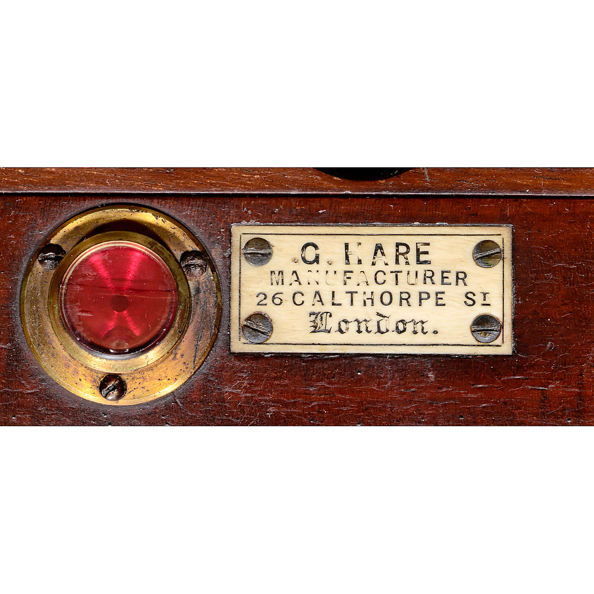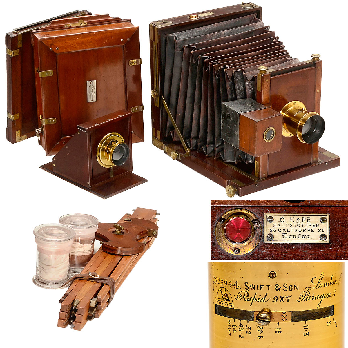 George Hare, London. Exclusive outfit: field camera 16 x 21 cm (6 ¼ x 8 ¼ in.), mahogany body with brass fittings, large optical viewfinder, "Rapid 9 x 7 Paragon" brass lens by Swift & Son (no. 3944) with iris stop. – Accessories: Right-angle mirror by A.W. Penrose & Co, London, with wide-angle lens "No. 2. W.A. Paragon", by Swift & Son, with two special cleaning cloths (in containers) for mirrors. Rare Kodak rollfilm magazine, marked "Dry Plate and Film Co." with wooden spools, wooden double cassette and wooden tripod. – Attractive and rare outfit!