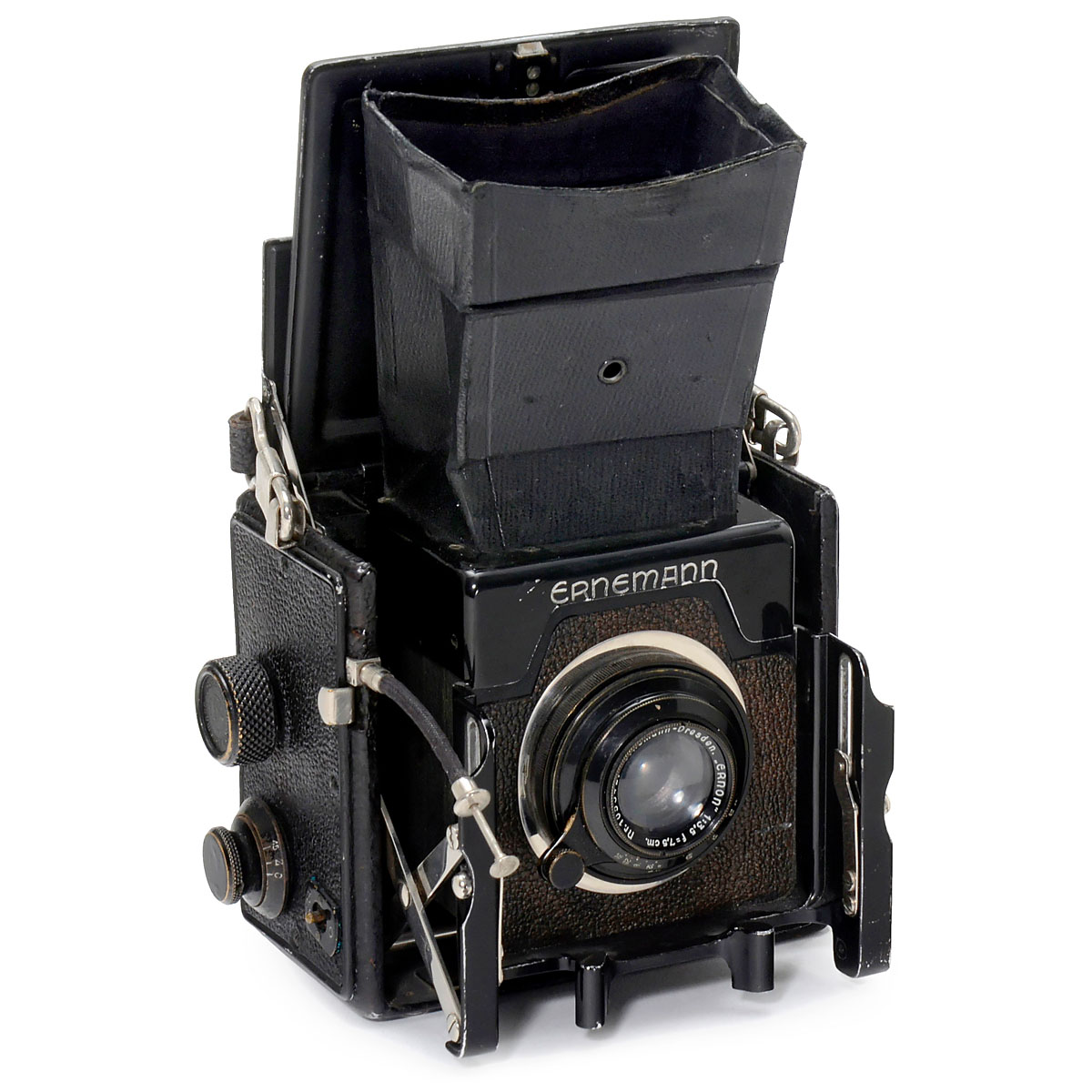 Ernemann, Dresden. One of the smallest folding SLR cameras ever made, plate size 4,5 x 6 cm! Focal plane shutter 1/1000 sec. (working, but sluggish), with Ernon 3,5/7,5 cm (no. 105342), body no. 1193496, focusing screen back. – Rare 4,5 x 6 cm SLR camera!