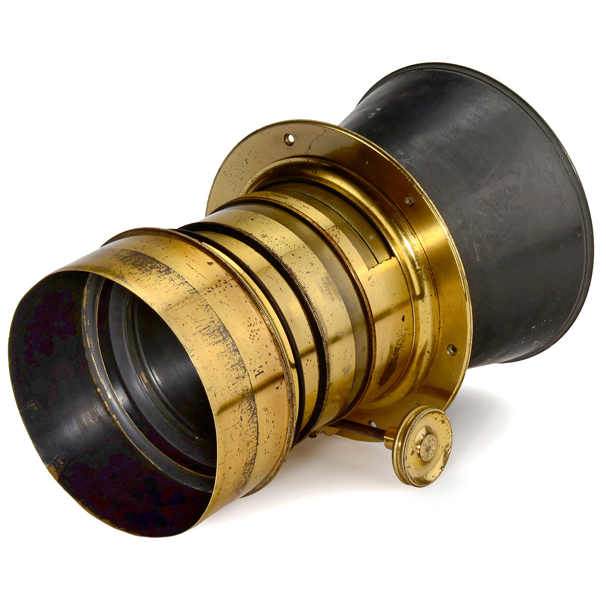 Jamin/Darlot, Paris. No. 6634. The seal on the lens is only partly legible since the barrel was cut to accommodate a waterhouse stop. – Literature: Corrado d'Agostini, "Photographic Lenses of the 1800's in France", p. 205. – This imposing lens has a height of 375 mm. The front lens (Paysage) shows a diameter of approx. 115 cm, whilst the rear lens has a diameter of approx. 150 mm. Rack-and-pinion focusing is working. – A very attractive piece!