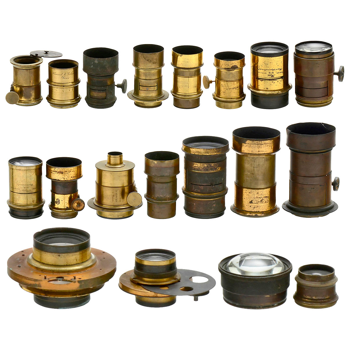 Various manufacturers: Lerebours, Derogy, Dallmeyer (2 x Soft Focus 3B), Ross, Horne & Thorntwaite, Lancaster & Son's, Kranz and unmarked lenses. Defects: optics (elements) missing, rack-and-pinion focusing missing, faulty optics, mechanic fault etc. – A pool of spare parts!