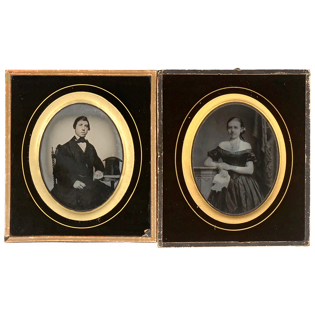 Anonymous. 2 x ¼ plate, young lady and young gentleman, visible image size 7,5 x 10 cm, hand-tinted.