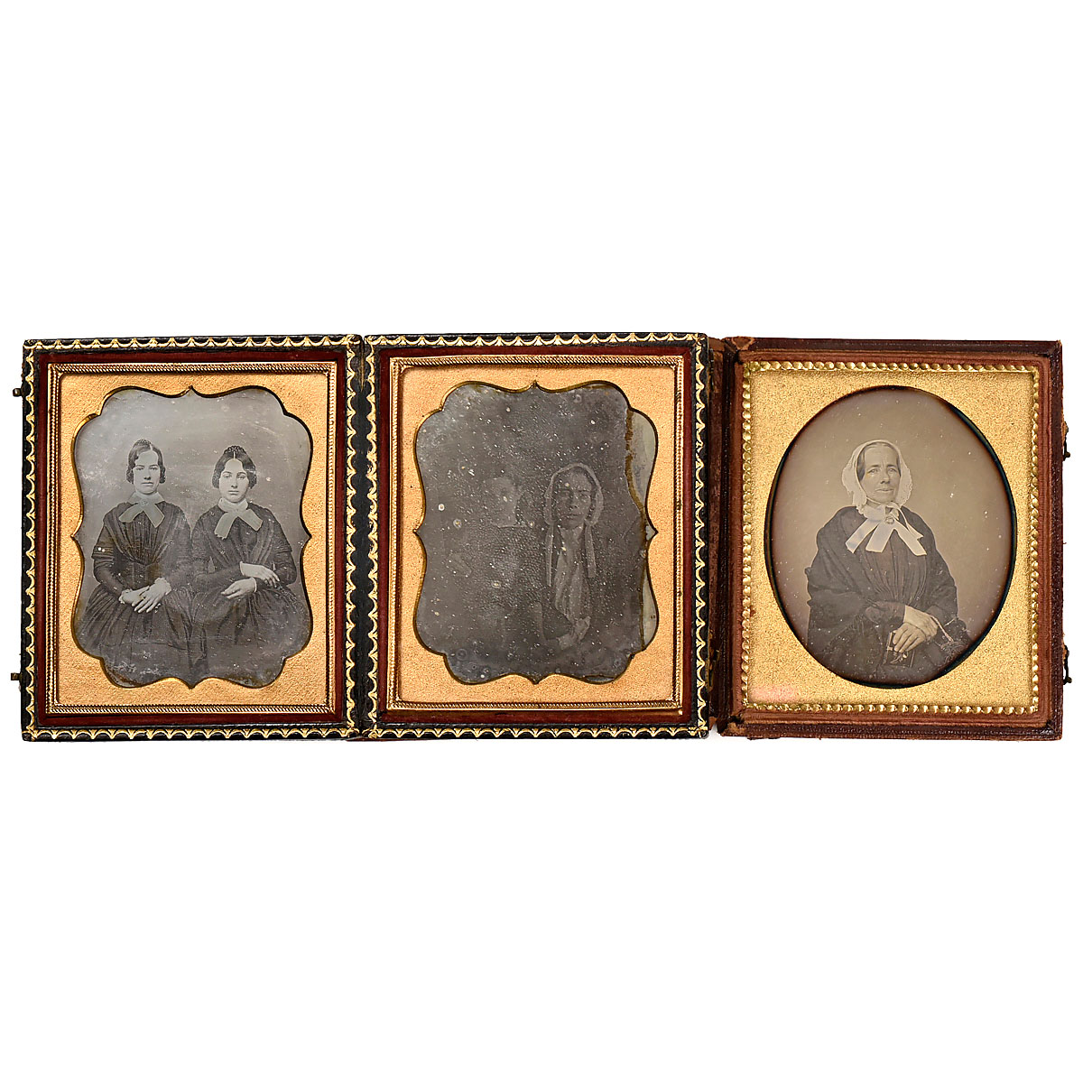 1) 2 daguerreotypes in double case, anonymous, c. 1845, 1/8 plate, portrait of young ladies. – And: 2) Daguerreotype, anonymous, c. 1845, 1/8 plate, portrait of a lady, nicely hand-colored, excellent illumination!