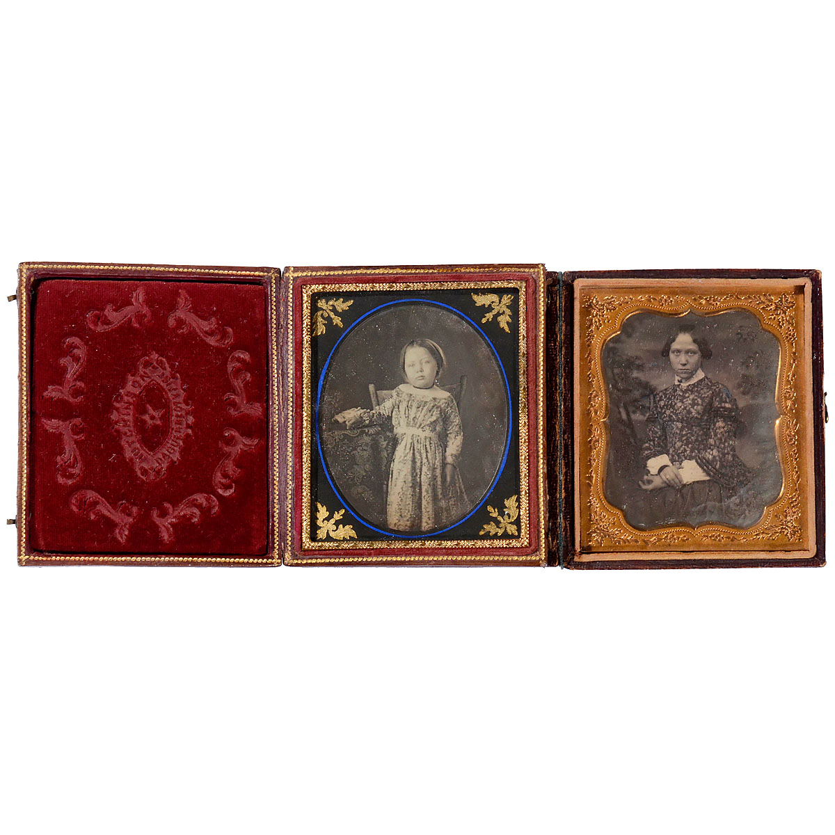 2 daguerreotypes from USA, 1/6 plate. 1) Marked: "Hutchinson Daguerreotypist", portrait of a child, excellent illumination and condition, newly-framed, dark-blue passe-partout with floral pattern, embossed leather case with clasps. (2-/–) – And: 2) Anonymous, portrait of a young lady, passe-partout and case with floral pattern and clasp, back of case glued. (3/–) – In addition: 10 postcards: Cologne, Düsseldorf, Rhine, 1950s.