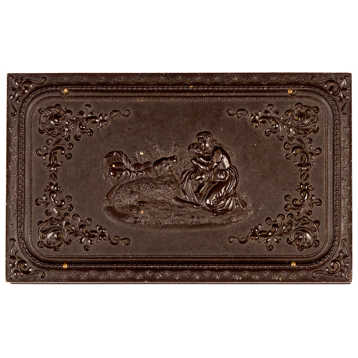 USA, anonymous. Case size 6 ¼ x 4 in., case with embossing of mother with child and a dog and floral border, case without damage! With 4 ambrotypes, 1/6 plate, hand-colored, brass passe-partouts. – Rare Union case!