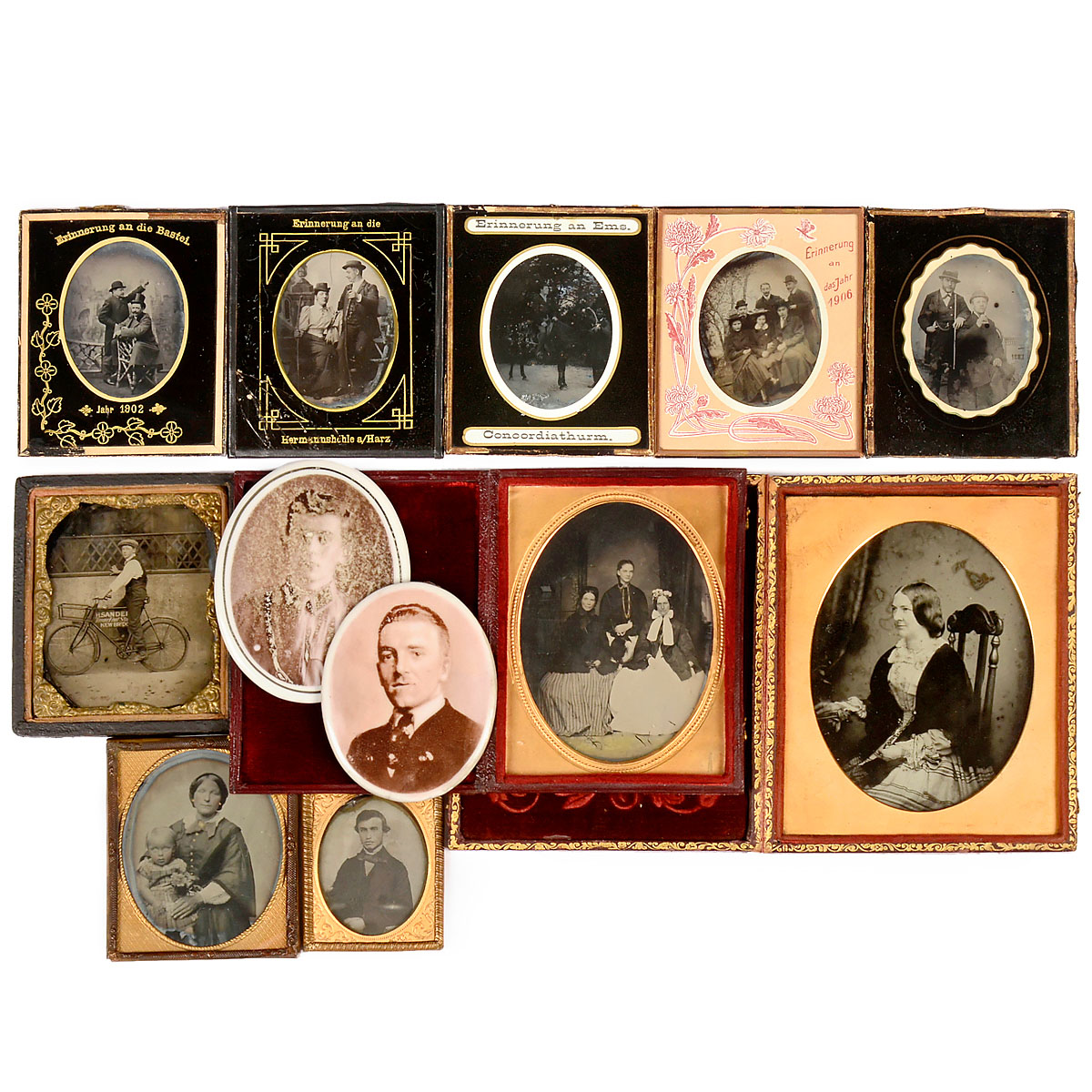 4 ambrotypes from Germany: "Erinnerung an Ems", "… an das Jahr 1906", "… an die Hermannshöhle a/Harz" and "… an die Bastei 1902". – 6 further Ambrotypes in various formats, framed, two with cases. – In addition: 2 porcelain pictures, size 2 ¾ x 3 ½ in.
