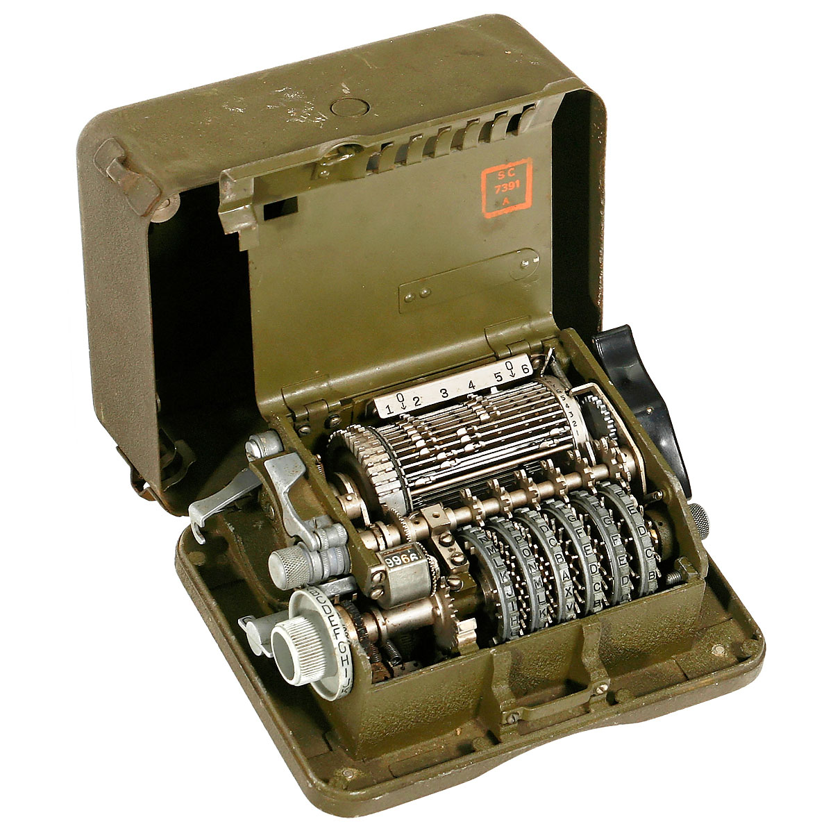By L.C. Smith & Corona Typewriters Inc. based on the Swedish Hagelin-Cryptos system. WWII cipher machine "Hagelin Converter", portable OSS type M-209-B Converter Signal Corps. Used in the field to encrypt and decrypt messages and provide a high degree of security when operators are fully versed in the necessity of strict compliance with security measures. The code was changed each day by selecting a different setting for the rotors. The operator could keep the machine on his knee in the field or when en-/deciphering in a moving vehicle. – Rare to find in Europe! Mechanism sticking.