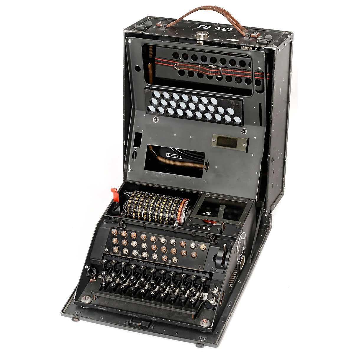 Nema T-D ciphering machine by Zellweger A.G., Uster. No. 421, rare 10-rotor successor of the legendary "Enigma" WWII ciphering machine, produced exclusively for the Swiss army. Only 640 examples of this rare machine were made and it was never marketed officially. With cord, extra lamps, keys and extra lamp panel. A great collector's item and exhibition piece.