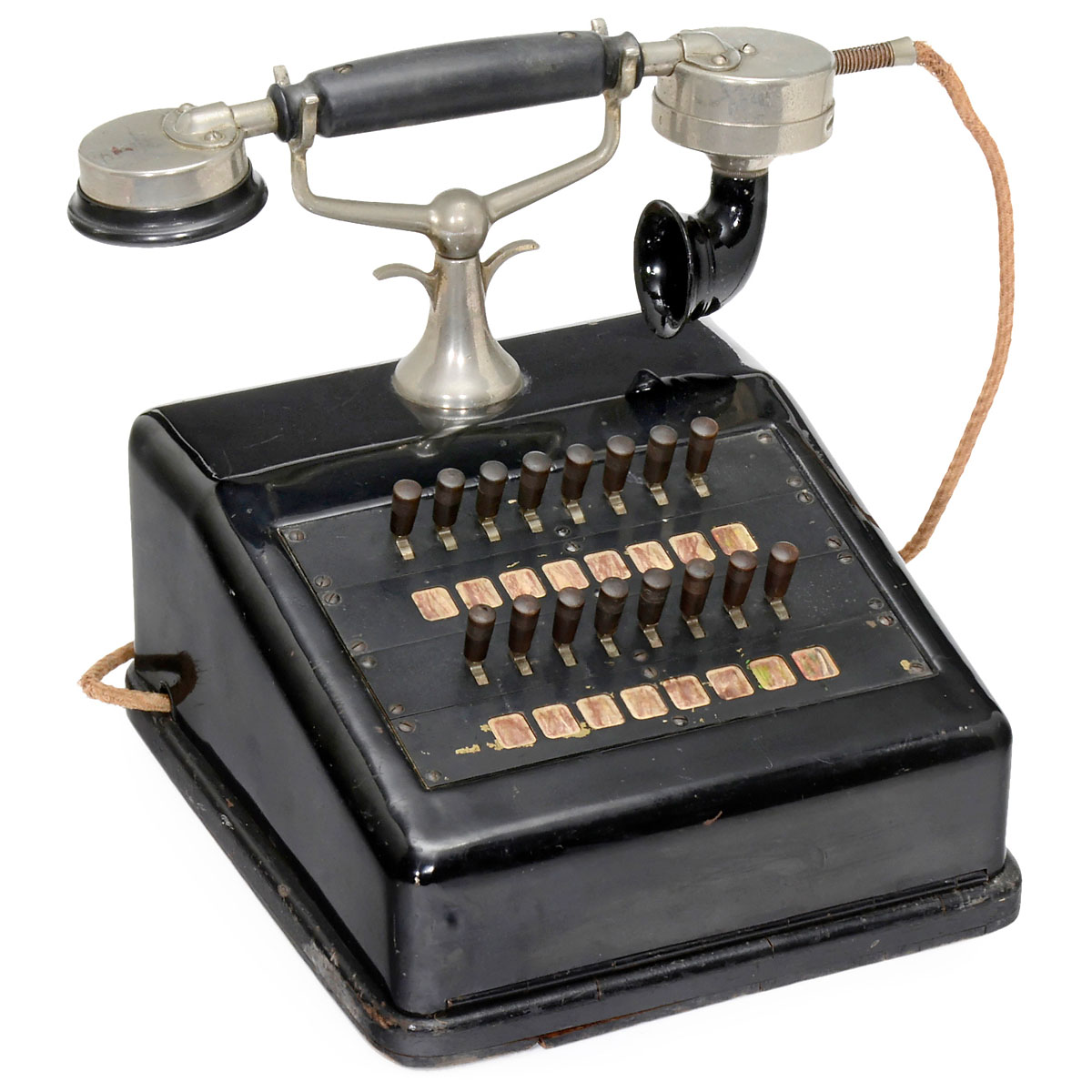 Probably by Siemens & Halske, for 16 lines, metal case, horn-type microphone.