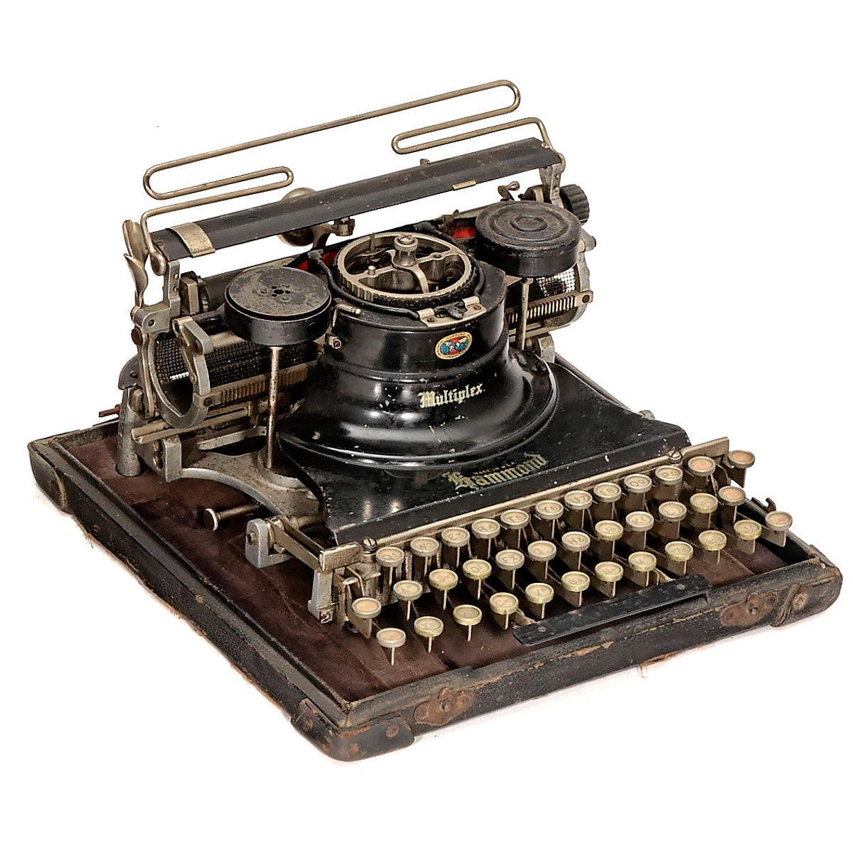 1) "The Emerson No. 3", 1907. Attractive American design. Carriage escapement faulty. Rarely found in Europe. Serial no. 2472. (3/4) – And: 2) "Hammond Multiplex", 1913. American typesleeve machine with universal keyboard and case. Serial no. AL200890. (3-/4)