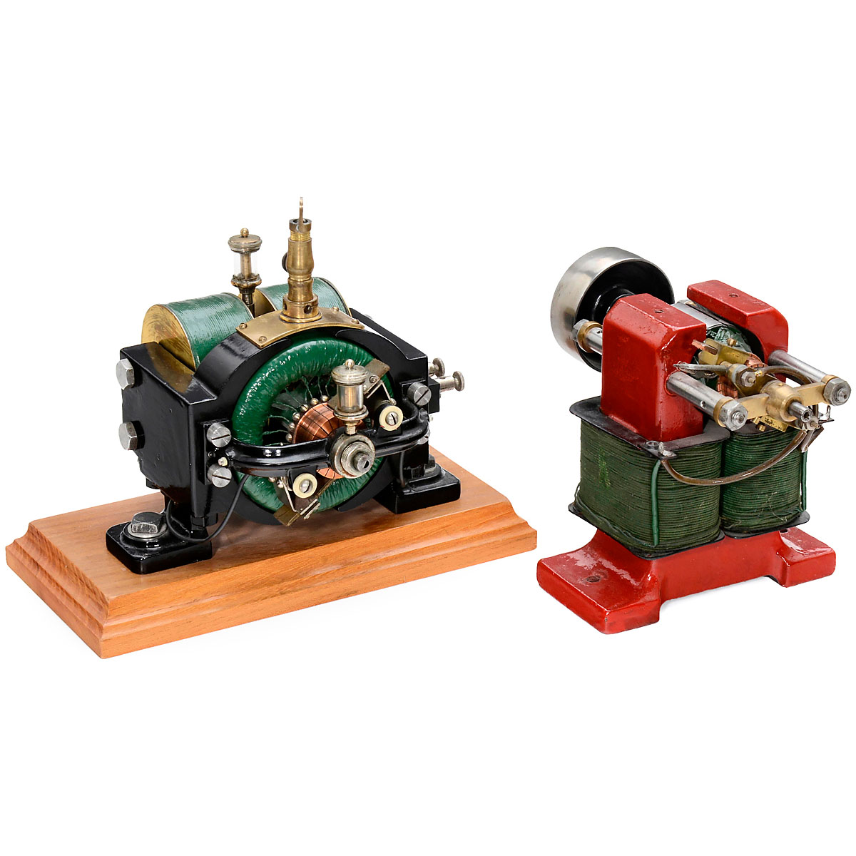Demonstration models, direct current, with belt pulleys, 1 x 70 V, 1 x approx. 30 V, height 6 and 8 ¼ in. Both motors work.