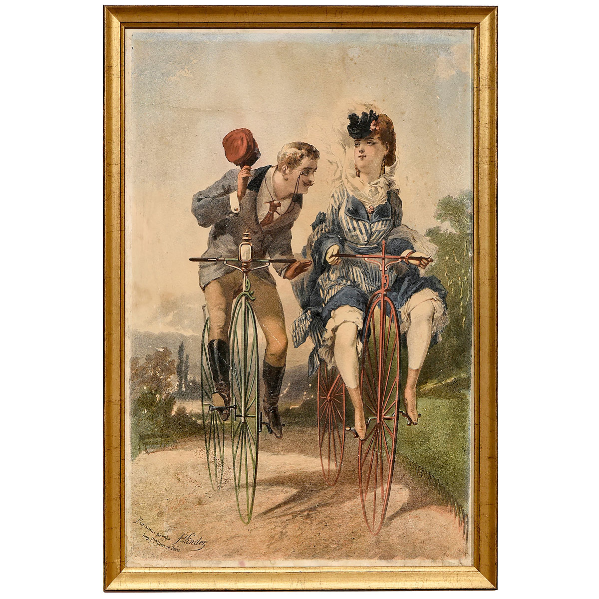 An elegant couple on the first penny-farthing bicycles. Lithograph after Pierre-Jacques Linder (1835–1914). Printed by Imprimerie François Delarue, Paris. Size: 31 x 47 cm (12 1/3 x 18 ½ in.). Framed. – Exceptionally rare!
