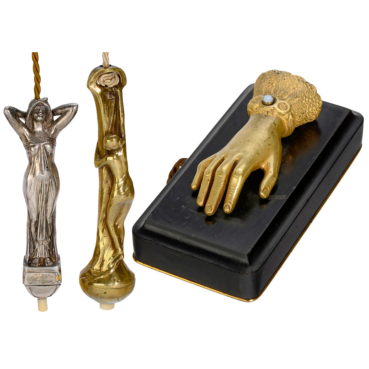 1) Finely modeled female nude, signed "Rubenstein", bronze, height 5 in. – 2) Bell hand, bronze, gemstone button, ebony base, 4 1/3 x 2 1/8 in. – And: 3) Lady in evening dress, silvered bronze, bone button, height 4 ½ in.